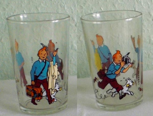 Verre avec 3 illustrations de Tintin : courant avec un appareil photo, marchant en saluant et marchant en saluant avec un valise