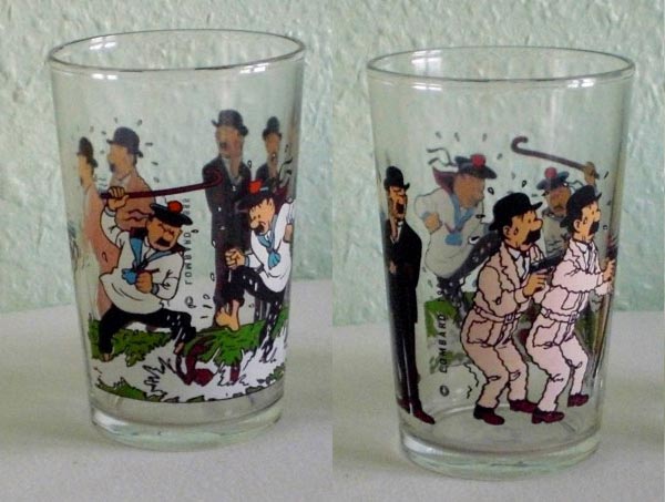 Verre avec 3 illustrations des Dupondt : debout en costume noir, se battant avec un crabe et tremblant de peur