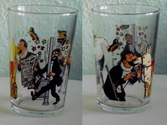 Verre avec 3 illustrations de Haddock : se faisant mordre par un lama, se tapant dans un poteau et mettant le pied dans un seau