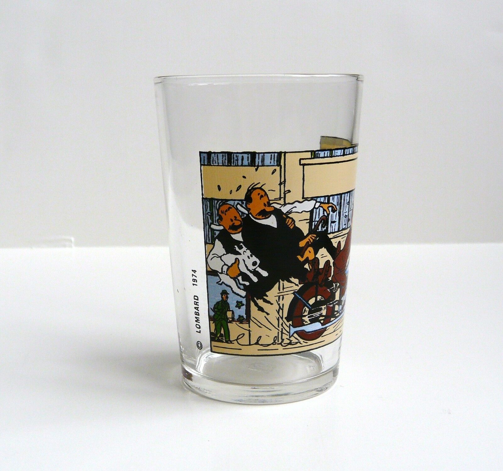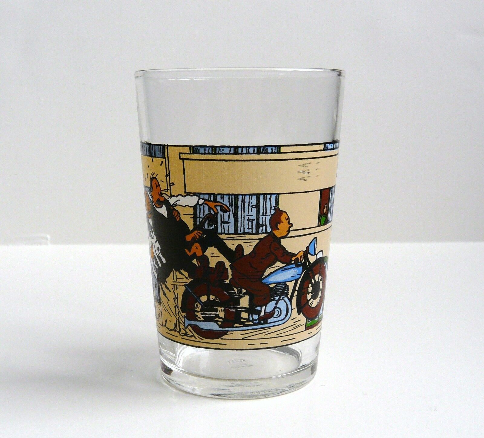 Verre édité par Lombard, représentant les Dupondt tombant de la moto conduite par Tintin