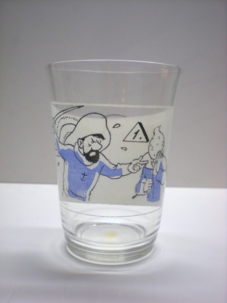 Série dite « évasée », toute première série de verres à l'effigie des personnages de Tintin et de ses amis. Distribuée dans les années 1950 par la Moutarderie Nivelloise.