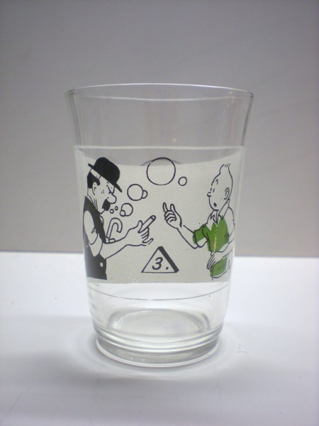 Série dite « évasée », toute première série de verres à l'effigie des personnages de Tintin et de ses amis. Distribuée dans les années 1950 par la Moutarderie Nivelloise.