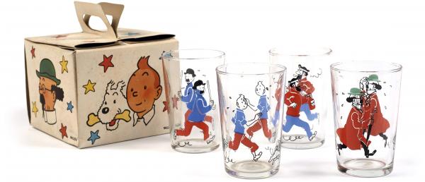 Ensemble de 4 verres Tintin édités par Céra dans les années 60, avec leur boite d'origine en carton.