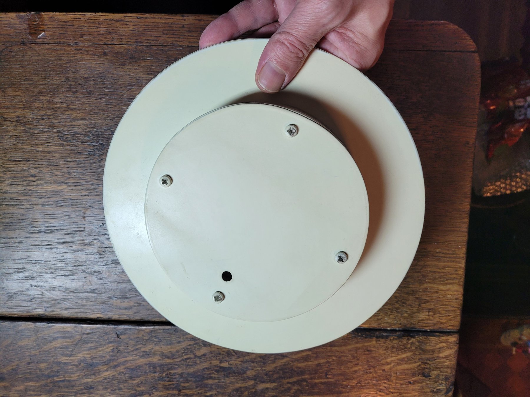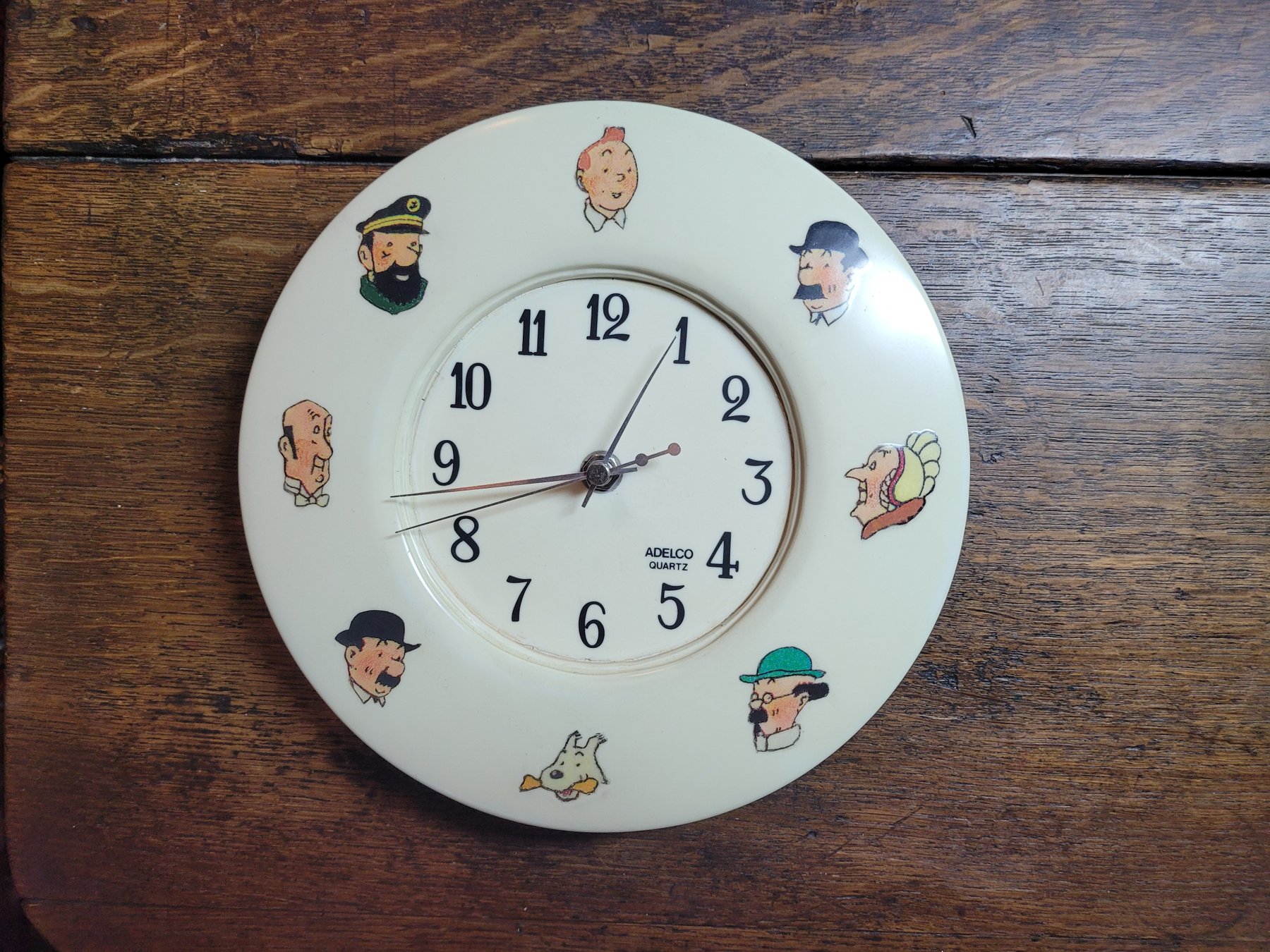 Horloge Tintin Adelco de 1962 illustrée des portraits de Tintin et ses amis. L'objet est obtenu à l'époque grâce à des bons de réduction disponibles dans le journal Tintin.