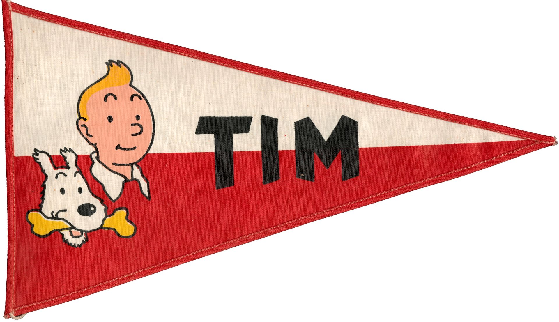 Fanion rouge et blanc, avec les bustes de Tintin et Milou et le nom TIM