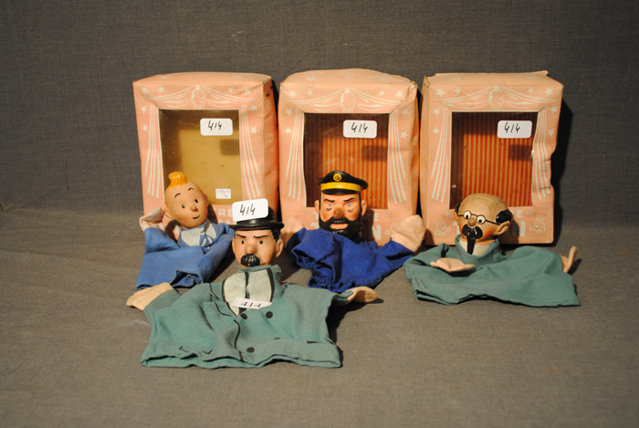 Marionnettes de la première génération des années 50 dans leurs rarissimes boîtes d'origine à motifs Tintin. Elles sont à l'effigie de Tintin, Milou, Haddock, Tournesol et les deux Dupondt.