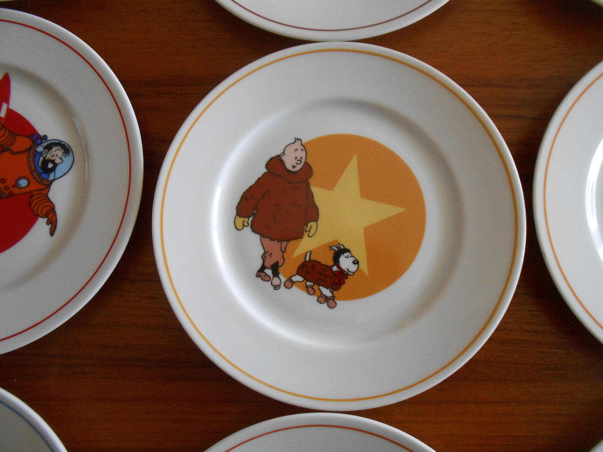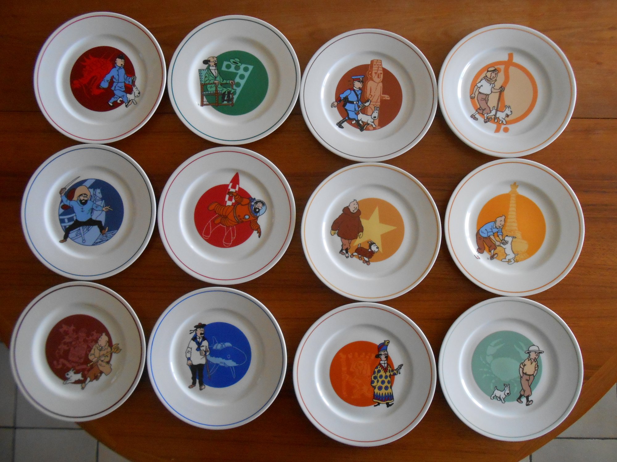 Série de 12 assiettes en porcelaine de 20cm, illustrées d'un symbole et d'un personnage de l'album représenté.