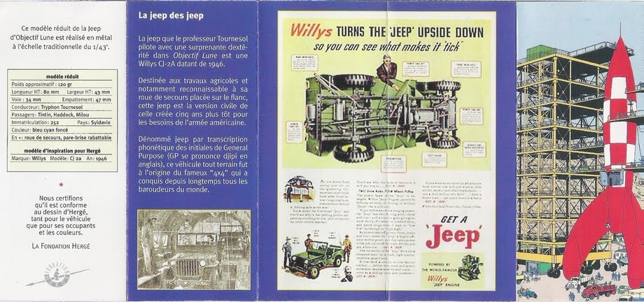 Hergé s'est inspiré de la Willys CJ2A pour dessiner la Jeep d'Objectif Lune. Elle fut la première jeep fabriquée en version civile, sa production commença le 17 juillet 1945 et 214.760 exemplaires furent fabriqués entre 1945 et 1949. Les Jeeps civiles (destinées notamment aux travaux agricoles) ont été inspirées de la célèbre Willys MB née cinq plus tôt et utilisée par l'armée américaine durant la seconde guerre mondiale. La victoire étant proche, Willys projeta de lancer une Jeep à usage civil. Peu de gens savent que la CJ2A avait deux ancêtres: la CJ-1 (mai 44) et la CJ-2 (1944/45) mieux connue sous le nom "AgriJeep".