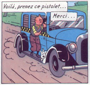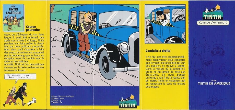 Conduite à droite : Le volant du taxi dessiné dans Tintin en Amérique se trouve à droite. Bien qu'à cette époque, en Amérique, la conduite à gauche était de mise, on peut penser qu'Hergé a fait fi de la réalité afin de mettre Tintin en évidence tout en respectant le sens de lecture des images.