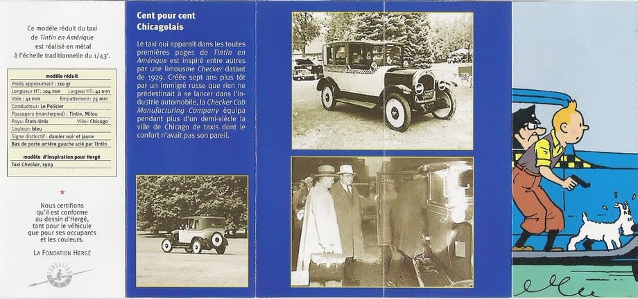 Le taxi qui apparaît dans les toutes premières pages de Tintin en Amérique nous rappelle sans aucun doute une limousine Checker datant du début des années 20. Créée en 1922 par Morris Markin, russe d'origine, tailleur de son état et que rien ne prédestinait à se lancer dans ce créneau de l'industrie automobile, alors ignoré par les constructeurs américains, la "Checker Cab Manufacturing Company" équipa pendant plus d'un demi-siècle la ville de Chicago de ses taxis dont le confort est resté légendaire et jamais égalé.