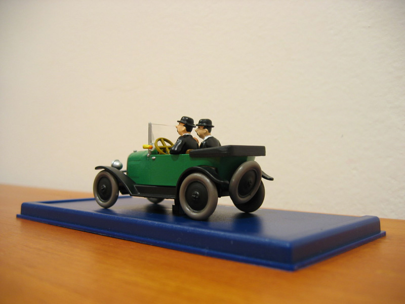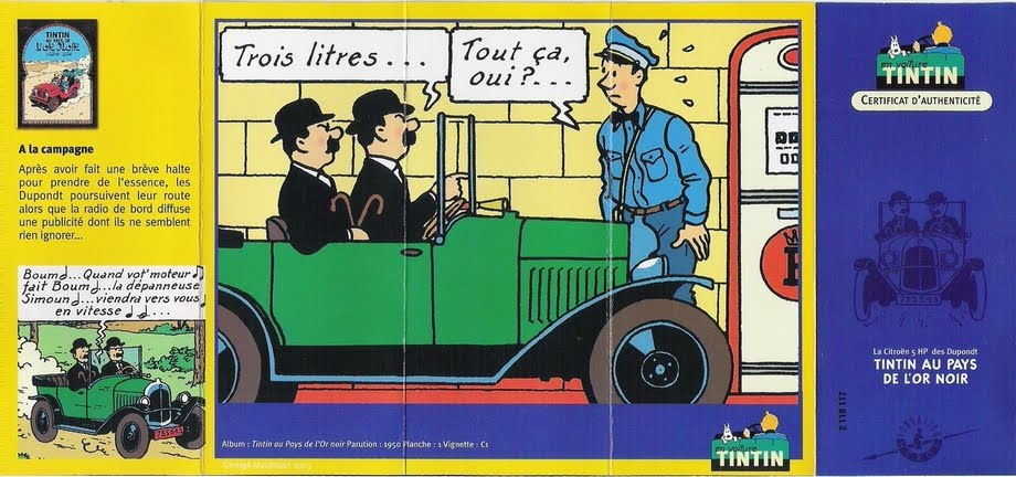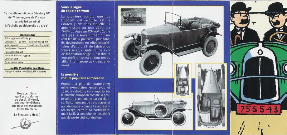Comme ils sont heureux dans leur petite auto ! Les Dupondt chantent en choeur avec la radio; Bel hommage à Charles Trenet. C'est leur voiture ! Ce ne sera pas la dernière. Les Dupondt ont un faible pour la marque aux deux chevrons. Ils rouleront, par la suite, dans une 2CV de fabrication française et puis de fabrication belge. Produite à plus de quatre-vingt mille exemplaires entre 1922 et 1926, la Citroën 5 HP, qui connut plusieurs modèles, s'imposa sur le marché comme la petite voiture économique par excellence. La signification de "HP" vient de l'anglais "horse power", unité de puissance exprimée en "chevaux".