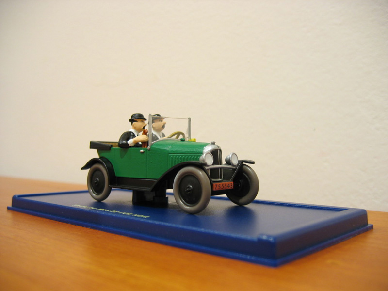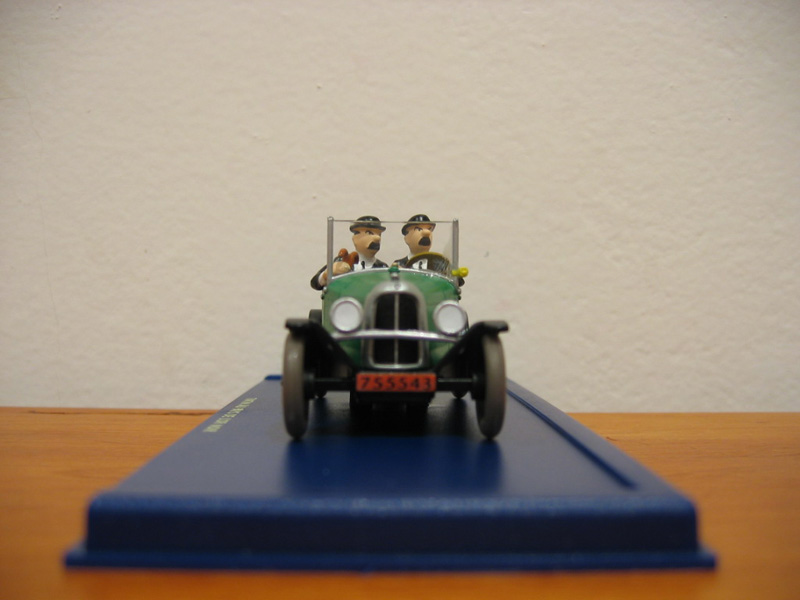 Symbole des produits dérivés de Tintin, la série "En voiture Tintin", éditée par Atlas. Un véritable succès populaire. Fruit d'un partenariat entre Moulinsart et les Editions Atlas, elle a ravi et ravit encore les tintinophiles. Prévue au départ sur une quarantaine de voitures, la collection a été agrandie pour inclure des modèles écartés à l'origine. Toutes sont issues des bulles de la série. On y croise aussi bien la jeep rouge de Dupont et Dupond endormis dans le désert que la Cadillac Fleetwood, le taxi de New-Delhi qu'utilise Tintin au Tibet. Spécialiste de ce genre de produit, Atlas propose des objets soignés (les personnages sont peints à la main) et des notices très précises qui décrivent même la documentation automobile utilisée par Hergé et les libertés qu'il a prises avec les modèles réels. Les miniatures sont fabriquées en Chine, mais les usines et les produits sont rigoureusement contrôlés par Moulinsart.