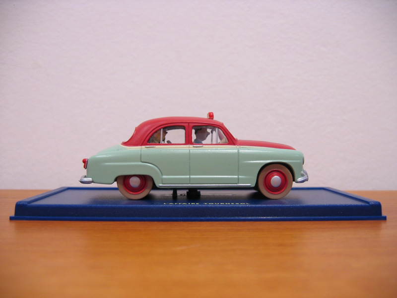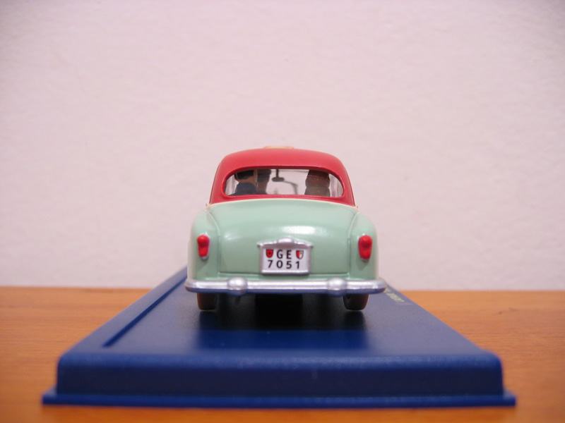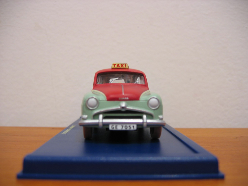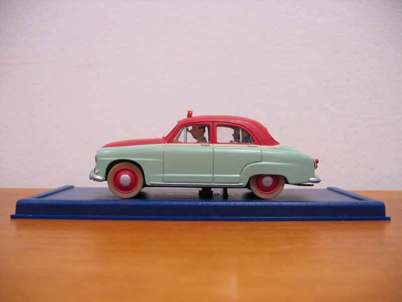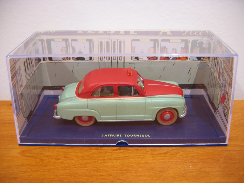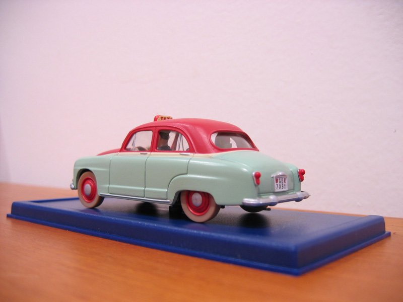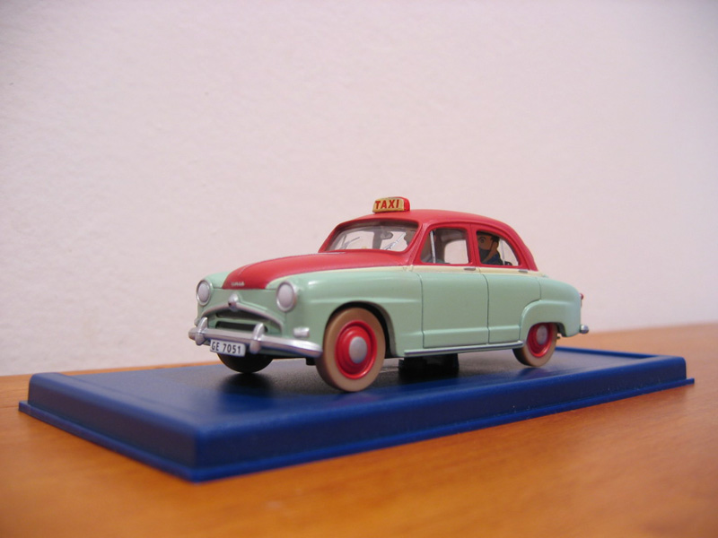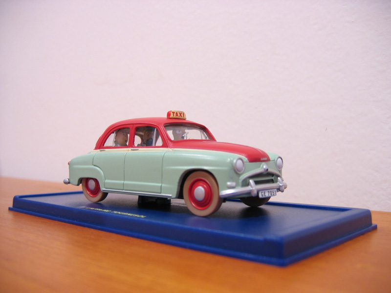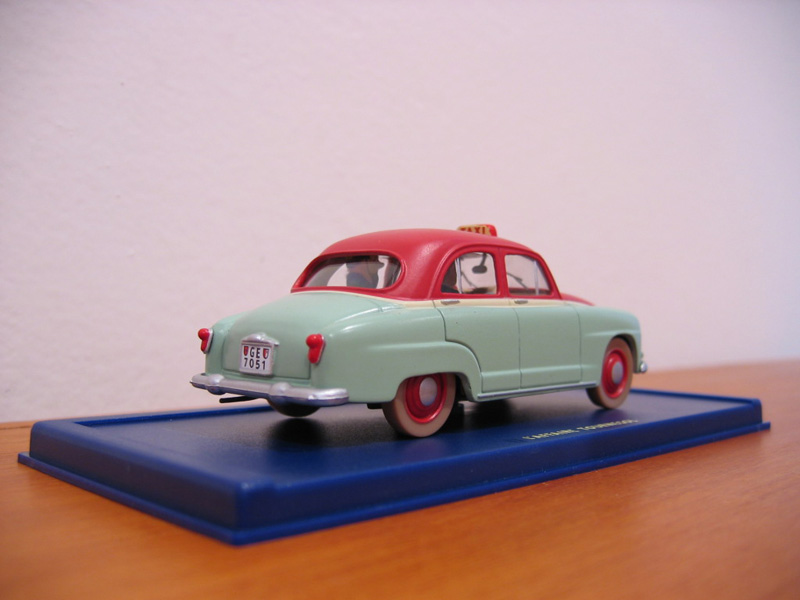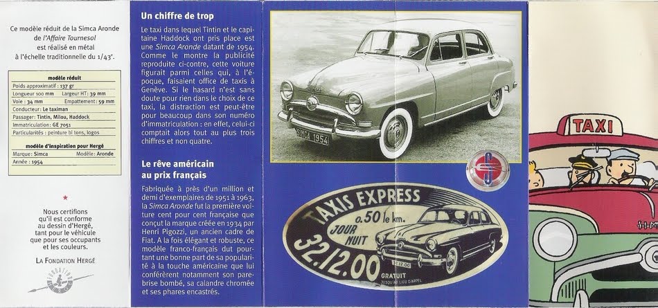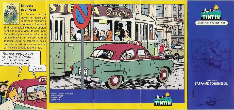 A Genève, Tintin et le capitaine Haddock sont venus pour rencontrer Tournesol qu'ils croient en danger. Pas de chance, celui-ci vient de partir pour Nyon pour y rencontrer, selon toute vraisemblance, un certain Alfredo Topolino. Aussi ne tardent-ils pas à prendre un taxi pour se rendre chez cet individu dont ils ignorent tout… Le taxi dans lequel Tintin et le capitaine Haddock ont pris place est une Simca Aronde datant de 1954. A l'époque, cette voiture était bien utilisée comme taxi à Genève.