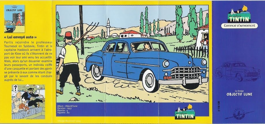 Symbole des produits dérivés de Tintin, la série "En voiture Tintin", éditée par Atlas. Un véritable succès populaire. Fruit d'un partenariat entre Moulinsart et les Editions Atlas, elle a ravi et ravit encore les tintinophiles. Prévue au départ sur une quarantaine de voitures, la collection a été agrandie pour inclure des modèles écartés à l'origine. Toutes sont issues des bulles de la série. On y croise aussi bien la jeep rouge de Dupont et Dupond endormis dans le désert que la Cadillac Fleetwood, le taxi de New-Delhi qu'utilise Tintin au Tibet. Spécialiste de ce genre de produit, Atlas propose des objets soignés (les personnages sont peints à la main) et des notices très précises qui décrivent même la documentation automobile utilisée par Hergé et les libertés qu'il a prises avec les modèles réels. Les miniatures sont fabriquées en Chine, mais les usines et les produits sont rigoureusement contrôlés par Moulinsart.