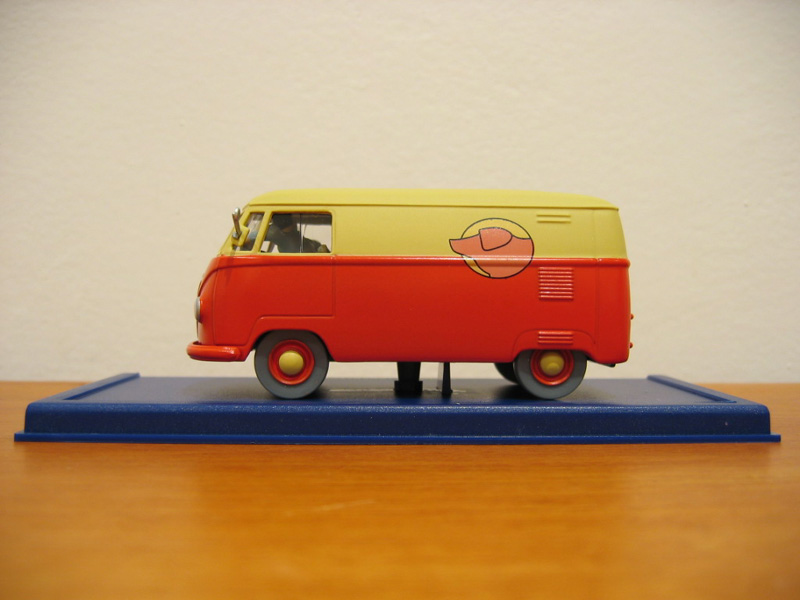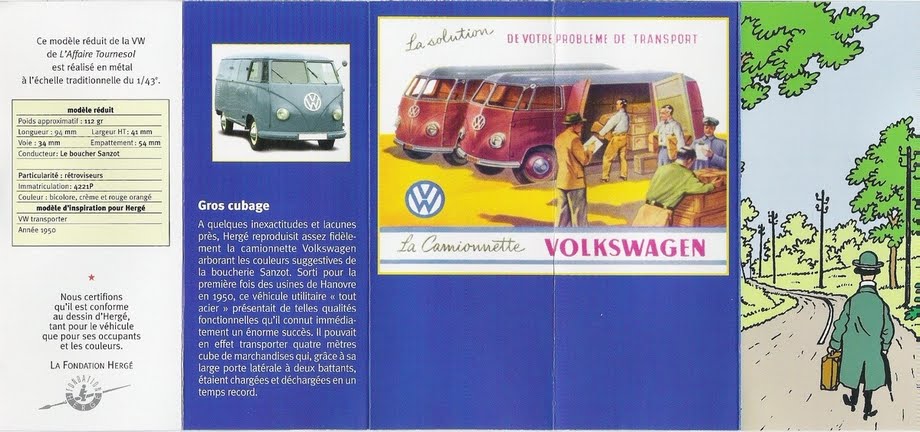 Alors qu'il se rend à pied au village de Moulinsart pour y prendre le train, le professeur Tournesol s'approche sans le savoir d'une voiture dont les occupants sont pour le moins suspects ! Arrive alors la camionnette de la boucherie Sanzot qui s'arrête pour embarquer Tournesol. Le plan des scélérats a cette fois échoué. Cette camionnette colorée (bicolore, crème et rouge orangée) et marquée de l'enseigne boucherie Sanzot est une camionnette VW. A quelques inexactitudes et lacunes près, les Studios Hergé reproduisirent fidèlement ce véhicule utilitaire tout acier. Le VW transporter est sorti pour la première fois des usines de Hanovre (et non de Wolfsburg) en 1950. Il pouvait transporter jusqu'à quatre mètres cube de marchandises.