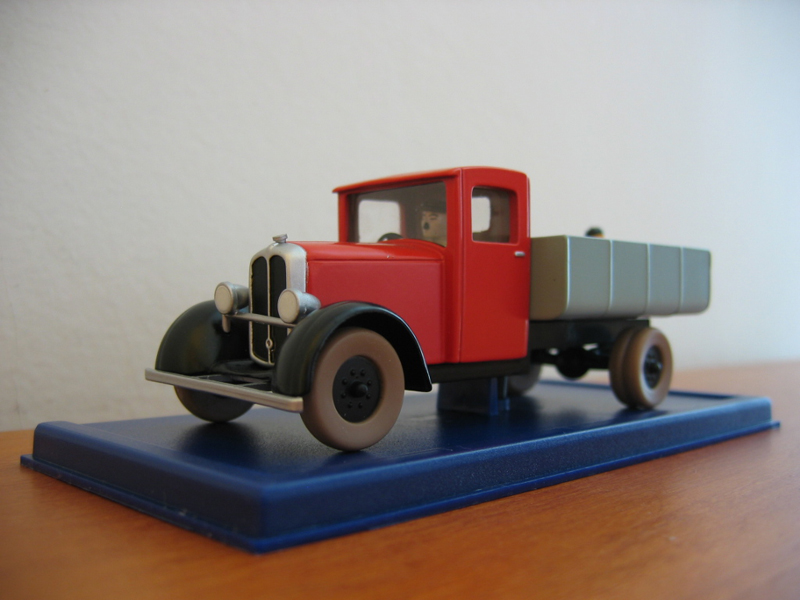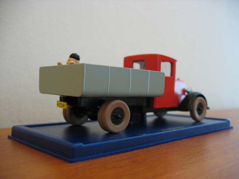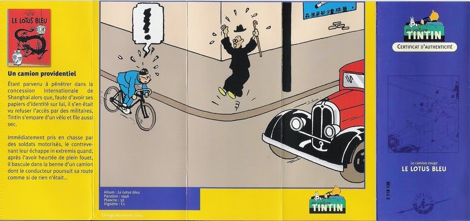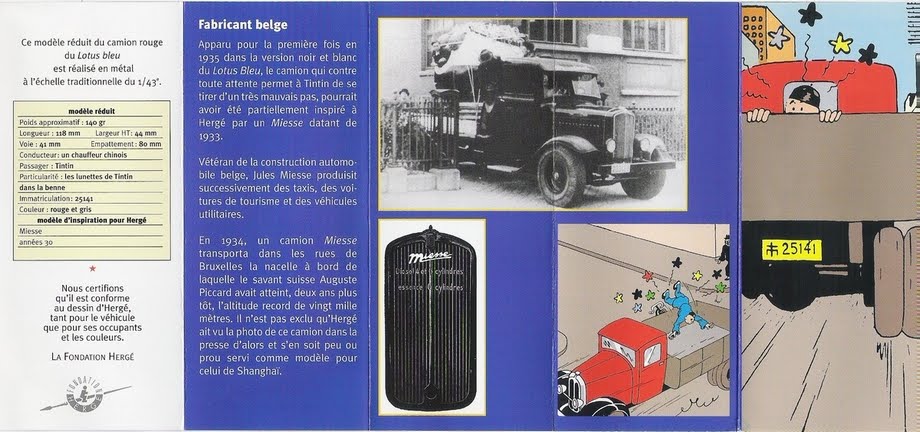 Arrivé dans la concession internationale, Tintin s'empare d'un vélo pour fuir les soldats anglais peu coopératifs. Sa fuite sera de courte durée car stoppée par une collision avec un camion qui le propulse dans la benne de celui-ci. C'est ce même camion qui lui permet d'échapper à ses poursuivants. Apparu pour la première fois en 1935 dans la version noir et blanc du Lotus bleu, ce camion pourrait avoir été partiellement inspiré par un Miesse datant de 1933. En 1934, un camion de ce type transporta dans les rues de Bruxelles la nacelle dans laquelle Auguste Picard atteignit l'altitude record de vingt mille mètres. Il est possible que Hergé ait vu les photos dans la presse et s'en soit servi comme modèle pour réaliser celui du lotus bleu.