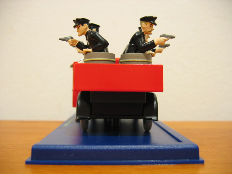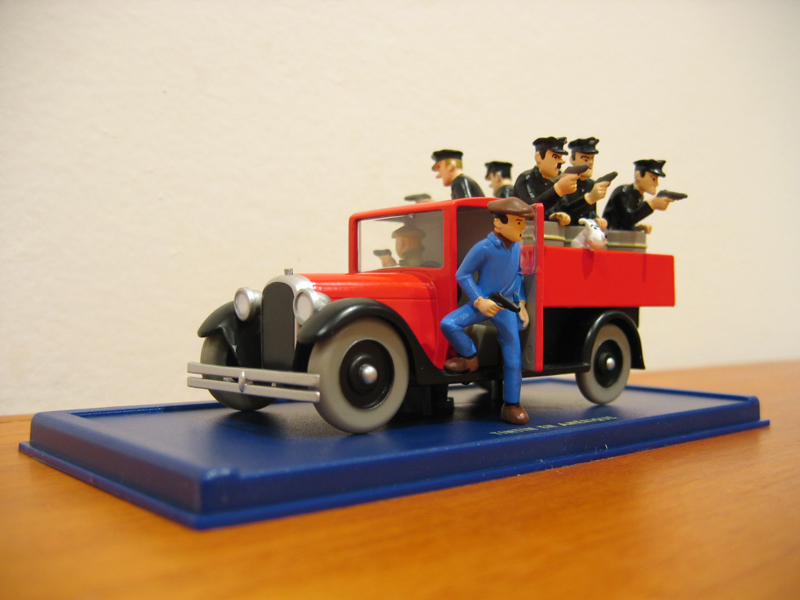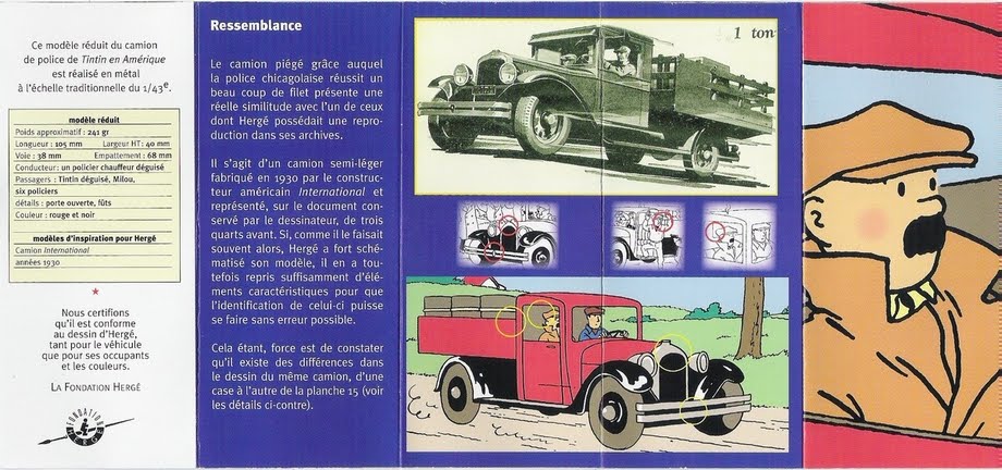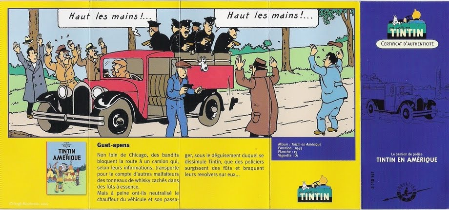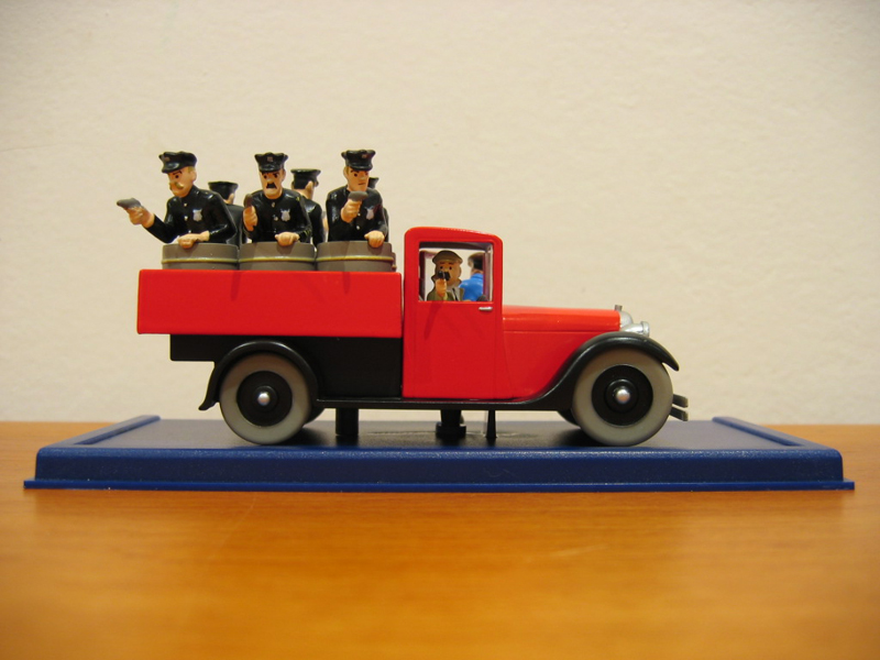 Non loin de Chicago, des bandits dressent un barrage et bloquent un camion qui selon eux transporte une cargaison de whisky cachée dans des fûts à essence. Malheureusement pour eux, derrière ce beau camion rouge se cachent Tintin et des policiers. Haut les mains ! Beau coup de filet. Ce camion rouge a de fortes ressemblances avec l'un de ceux dont Hergé possédait une reproduction dans ses archives. Il s'agit d'un camion semi-léger fabriqué en 1930 par le constructeur américain International. Hergé a fort schématisé son modèle tout en préservant les éléments caractéristiques du camion américain.