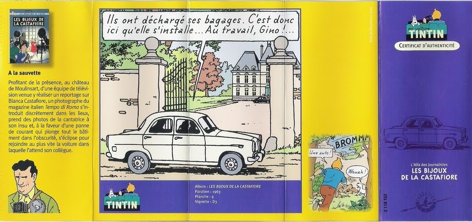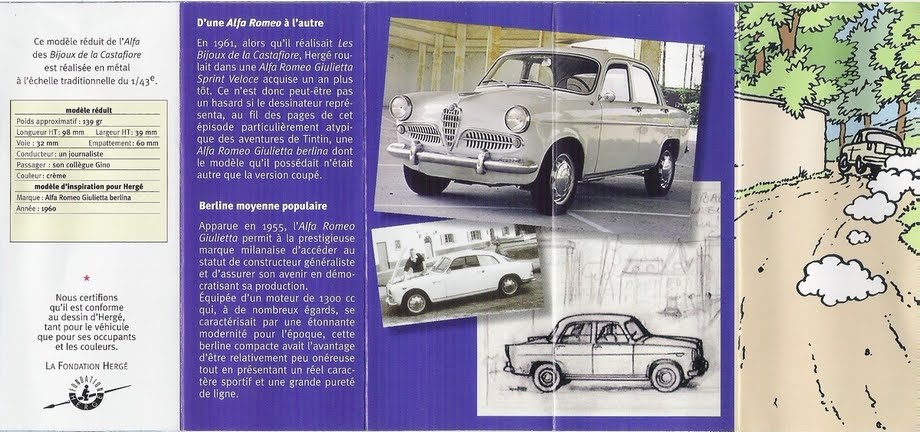 Hergé alfiste : Hergé est un amoureux des lignes italiennes. Ce n'est pas un hasard si Hergé reproduit cette berline pour la réalisation des Bijoux de la Castafiore (1961). Un an plus tôt, il avait craqué pour une Alfa Roméo Giulietta Sprint Veloce, la version coupé plus puissante 90 CV.