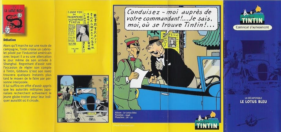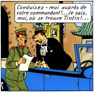 Alors qu'il marche sur une route de campagne, Tintin croise un cabriolet piloté par l'industriel américain avec lequel il a eu une altercation le jour même de son arrivée à Shanghaï. Regrettant d'avoir raté l'occasion de régler son compte à Tintin, Gibbons (c'est son nom) trouvera quelques instants plus tard le moyen de le faire par personne interposée. Le cabriolet en question est né de l'imagination d'Hergé inspiré par des modèles ayant vu le jour aux Etats-Unis au tout début des années 1930/44 et la CJ-2 (1944/45) mieux connue sous le nom "AgriJeep".