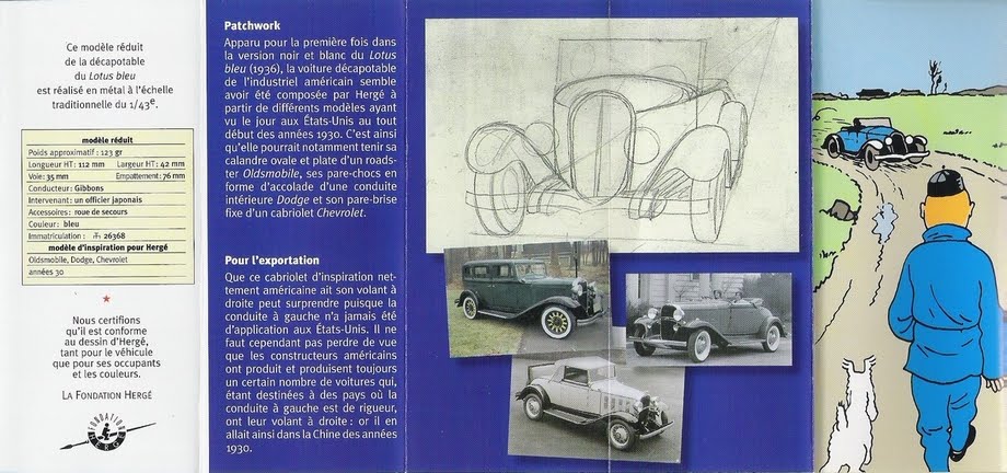 Symbole des produits dérivés de Tintin, la série "En voiture Tintin", éditée par Atlas. Un véritable succès populaire. Fruit d'un partenariat entre Moulinsart et les Editions Atlas, elle a ravi et ravit encore les tintinophiles. Prévue au départ sur une quarantaine de voitures, la collection a été agrandie pour inclure des modèles écartés à l'origine. Toutes sont issues des bulles de la série. On y croise aussi bien la jeep rouge de Dupont et Dupond endormis dans le désert que la Cadillac Fleetwood, le taxi de New-Delhi qu'utilise Tintin au Tibet. Spécialiste de ce genre de produit, Atlas propose des objets soignés (les personnages sont peints à la main) et des notices très précises qui décrivent même la documentation automobile utilisée par Hergé et les libertés qu'il a prises avec les modèles réels. Les miniatures sont fabriquées en Chine, mais les usines et les produits sont rigoureusement contrôlés par Moulinsart.