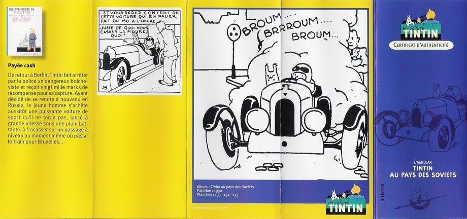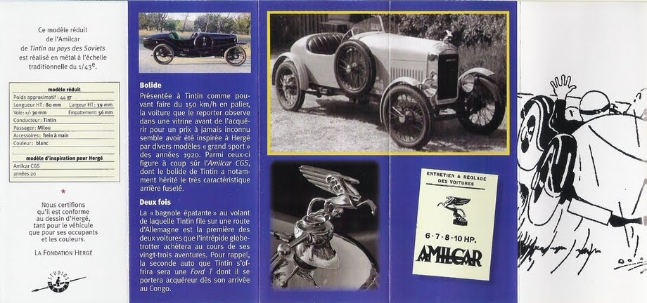 De retour à Berlin, Tintin fait arrêter par la police un dangereux bolcheviste et reçoit vingt mille marks de récompense pour sa capture. Ayant décidé de se rendre à nouveau en Russie, le jeune homme s'achète aussitôt une puissante voiture de sport qu'il ne tarde pas, lancé à grande vitesse sous une pluie battante, à fracasser sur un passage à niveau au moment même où passe le train pour Bruxelles? Le bolide présenté à Tintin semble avoir été inspiré à Hergé par divers modèles « grand sport » des années 1920. Parmi ceux-ci figurent à coup sûr l'Amilcar CGS.