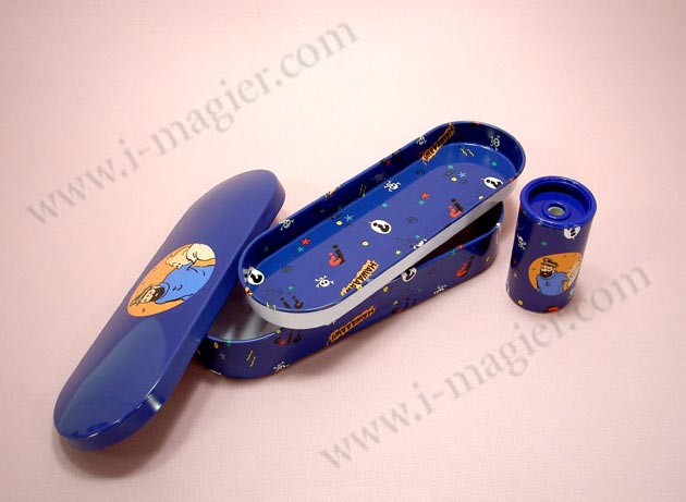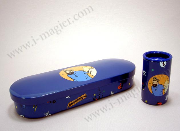 Plumier métallique ovale, représentant Tintin et Haddock, avec son taille-crayons assorti.