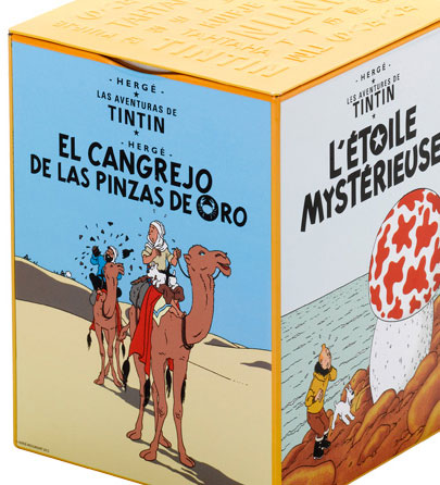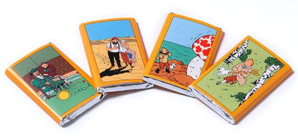 Boîte de chocolat Jeff de Bruges, illustrée des couvertures de "L'Étoile Mystérieuse", "Le Crabe aux Pinces d'Or", "Les 7 Boules de Cristal" et "Le Sceptre d'Ottokar".