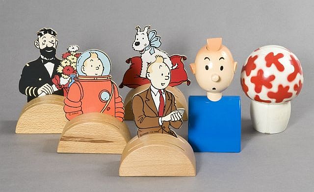 2 autres tirelires ont également été produites à la même période, l'une représentant le champignon de l'Étoile Mystérieuse, l'autre Tintin stylisé en buste avec chemise bleue.