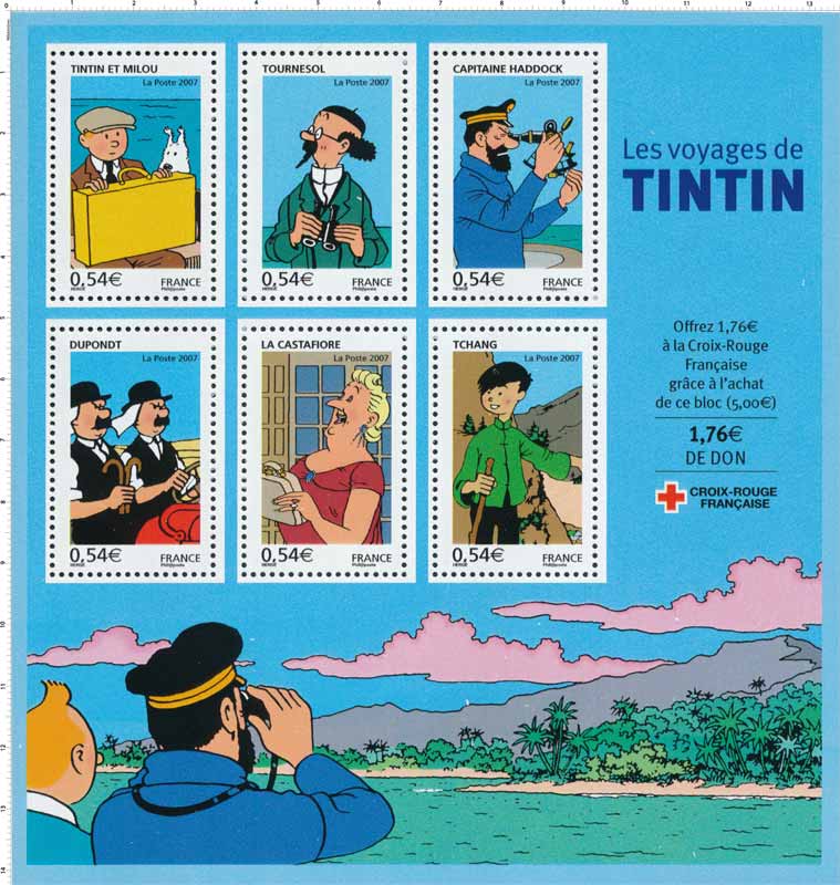 Les voyages de TINTIN Le 22 mai 1907 Georges Rémi naissait à Bruxelles. En 2007, la Poste commémore le centenaire de la naissance de Hergé à travers 6 timbres de la série Personnages célèbres mettant à l’honneur les personnages emblématiques de la BD Tintin, vus à travers le voyage : Tintin & Milou, Tournesol, le capitaine Haddock, les Dupondt, la Castafiore et Tchang. Le fond du bloc évoque également le voyage grâce à une illustration extraite de l’album Rackham le rouge