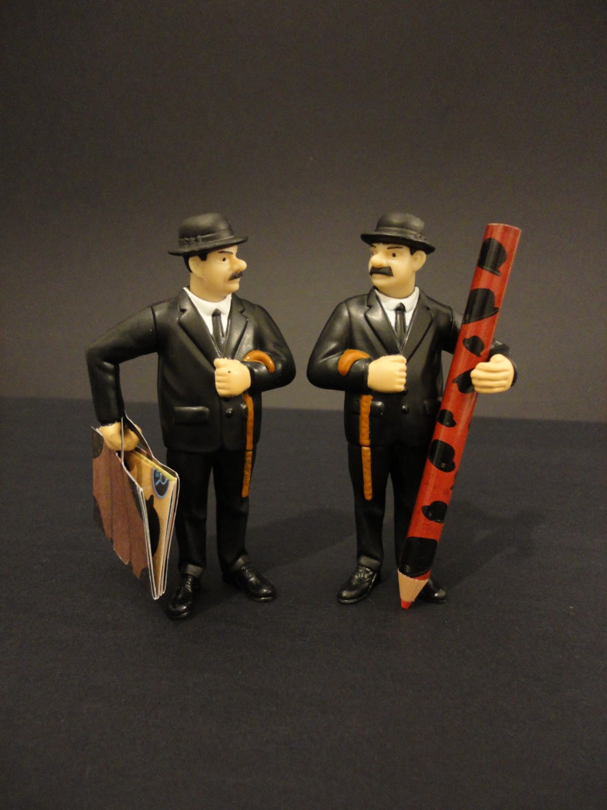Dupont, avec un crayon et Dupond avec un livret jeu plié sous forme de valise.