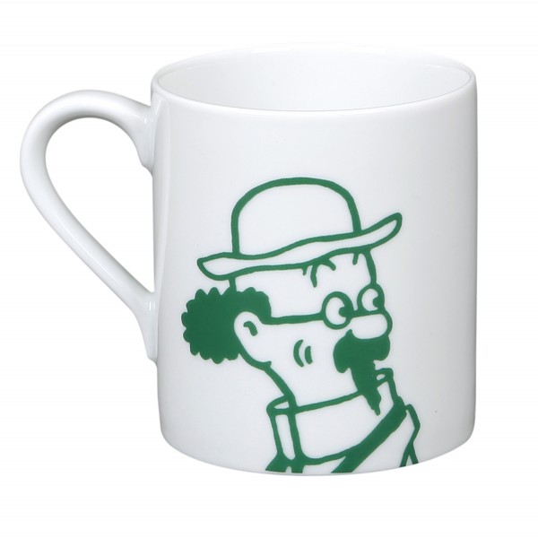 Ce mug en porcelaine, à l'effigie du professeur Tournesol, fait partie de la série « Personnages ». Le dessin, au trait vert foncé, est extrait d'une case des 7 Boules de cristal. Tournesol, après avoir salué ses amis, retourne à ses recherches.
