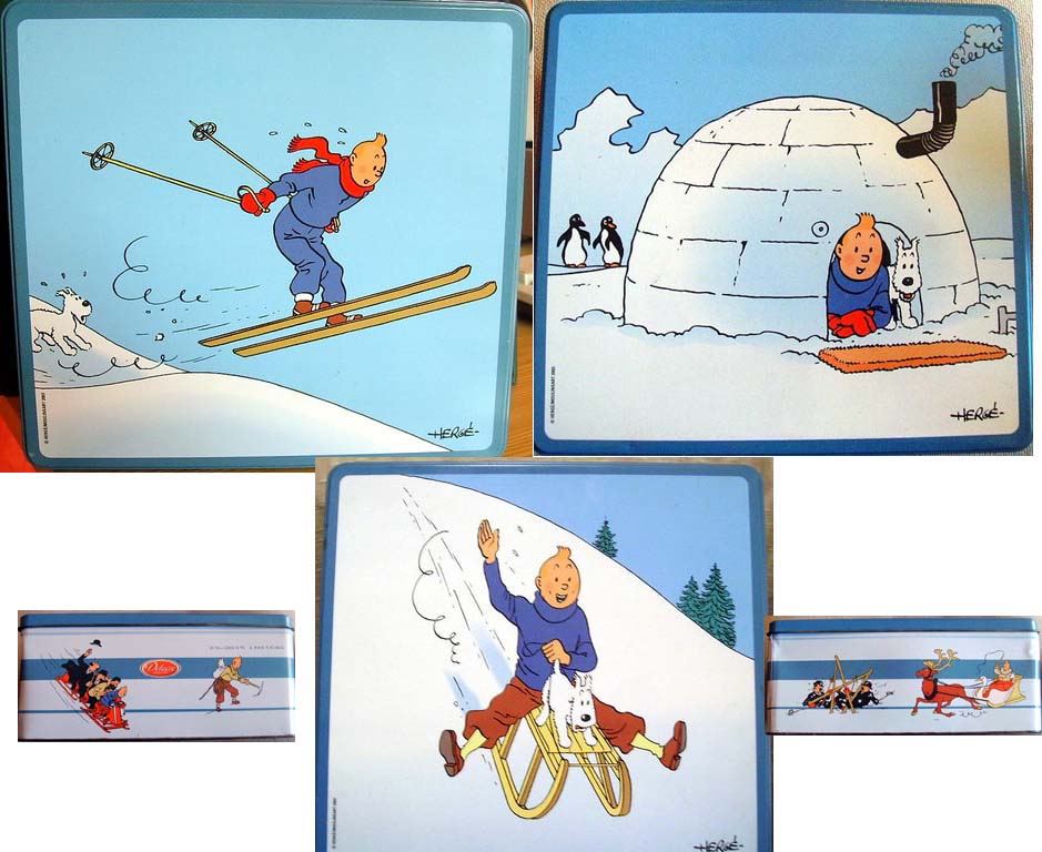 Boîte de Tintin sortant la tête par la porte d'un igloo.