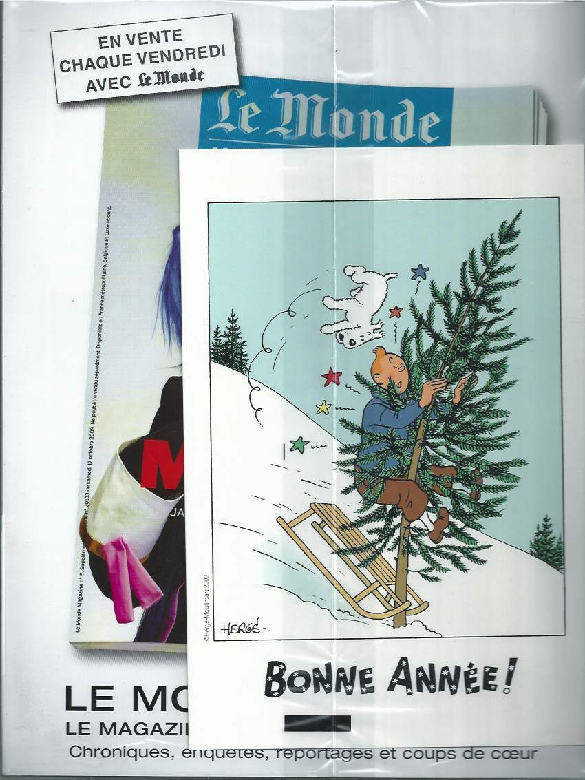 Série de 3 cartes postales offertes avec le supplément hors-série au journal Le Monde, « Tintin - le Retour » paru en décembre 2009. Chaque version du supplément était accompagnée d'une carte de vœux différente.