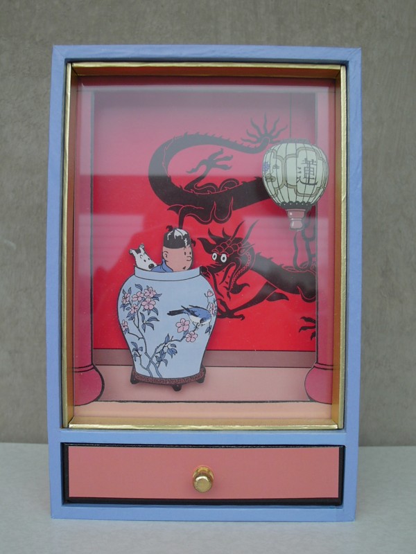 Boîte à musique animée. Lorsque le tiroir est ouvert, Tintin et Milou sortent de la potiche.