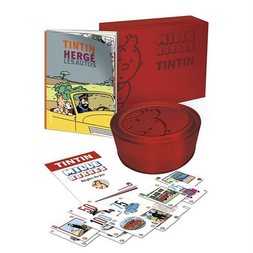 Édition prestige du jeu des Mille bornes version Tintin. Comprend l'abum "Tintin - Hergé - Les Autos", le livret "Les règles du jeu", 106 cartes de jeu et 4 cartes mémo dans une boîte métallique.