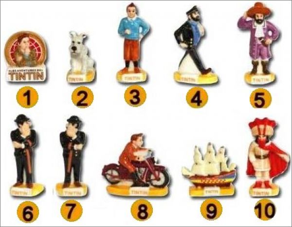 Série de 10 fèves, avec socle jaune. Toutes les fèves sont marquées "Tintin" à l'avant, et le nom du personnage à l'arrière.