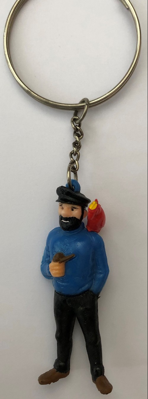 Les premières figurines en porte-clés semblent être celles produites par JIM dans les années 1960. Il existe deux modèles de Tintin : l’un de 62 mm et un plus petit de 53 mm avec un Milou collé, souvent disparu aujourd’hui. Haddock figure en deux versions de 65 et 62 mm, la dernière le représentant avec un perroquet rouge ou vert sur l’épaule.