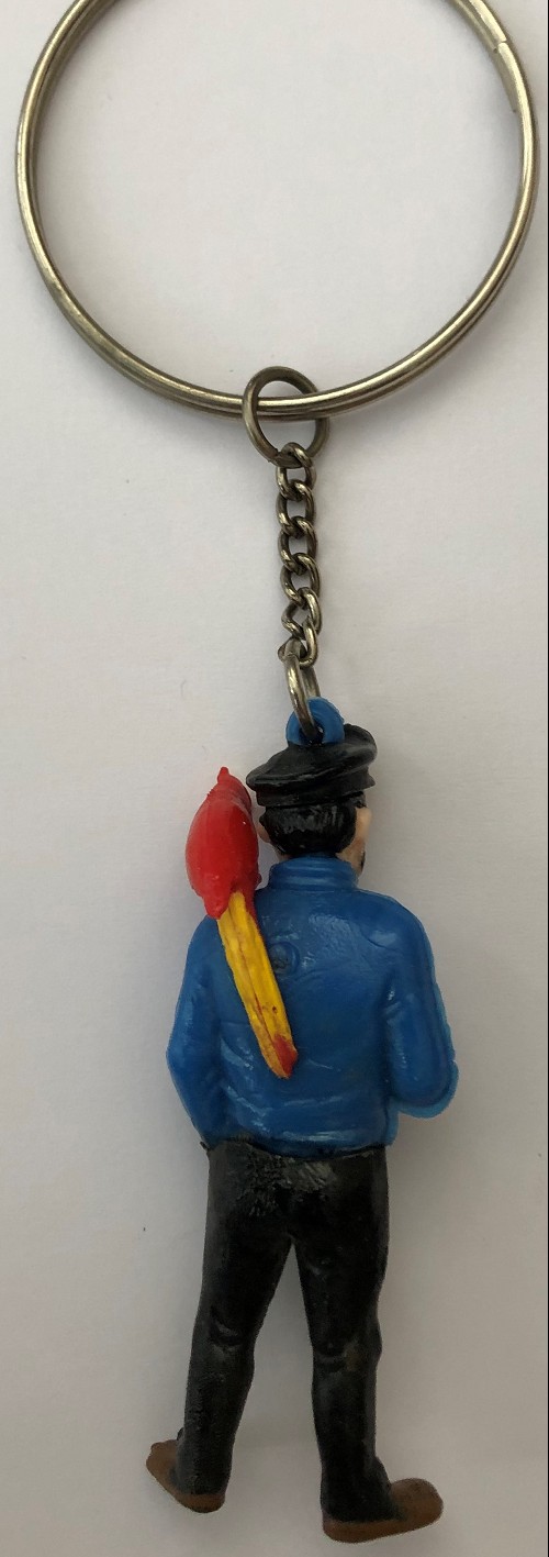 Sans marquage. JIM = Jouet Incassable Moderne. Haddock avec perroquet rouge sur l'épaule. Existe en variante avec un perroquet vert. Boucle d'attache probablement non d'origine.