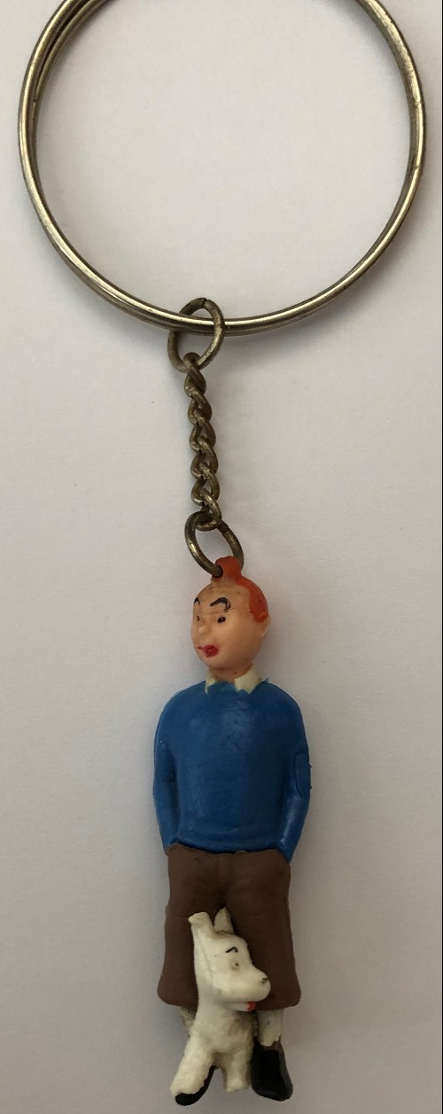 Les premières figurines en porte-clés semblent être celles produites par JIM dans les années 1960. Il existe deux modèles de Tintin : l’un de 62 mm et un plus petit de 53 mm avec un Milou collé, souvent disparu aujourd’hui. Haddock figure en deux versions de 65 et 62 mm, la dernière le représentant avec un perroquet rouge ou vert sur l’épaule.