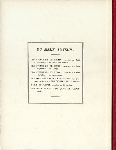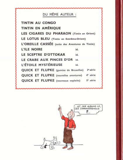 | Fac-similé de l'édition belge originale de 1955. © Casterman 2003. Imprimé en Belgique par Proost, Turnhout. Dépôt légal : mai 2003; D.2003/0053/187. | |||||