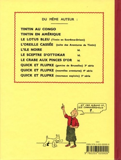 | Voir la couv. | 05/2003 | B15Voir la photo du 4e Plat | Coul. | Fac-similé de l'édition belge originale de 1955. © Casterman 2003. Imprimé en Belgique par Proost, Turnhout. Dépôt légal : mai 2003; D.2003/0053/187. | 20 EUR |
