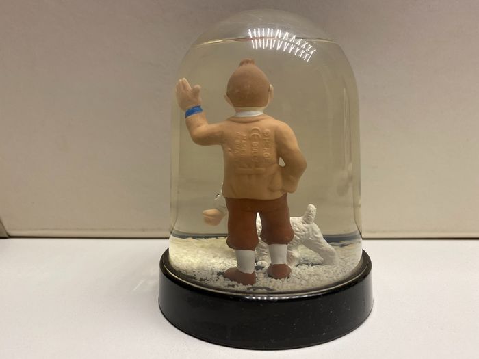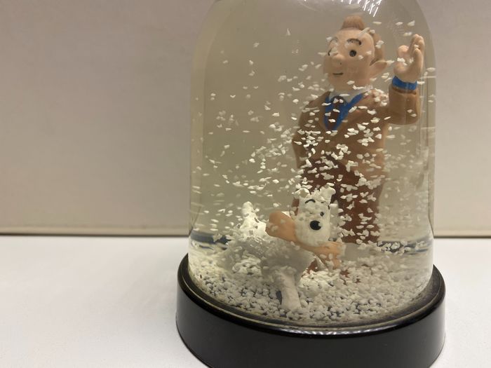 Boule à neige contenant les figurines Bullyland de Tintin et Milou (version Bullyland souple, Milou os rose).