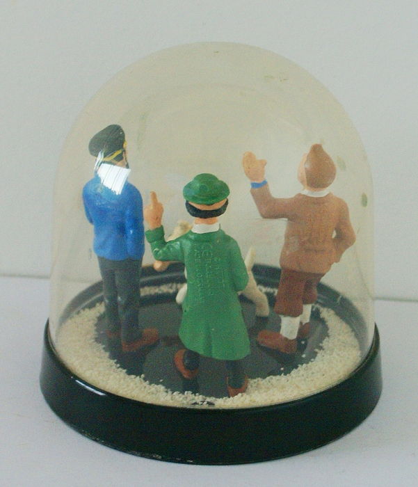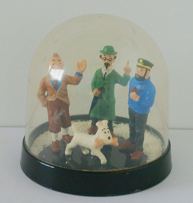 Boule à neige contenant les figurines Bullyland de Tintin, Milou, Haddock et Tournesol (version Bullyland souple, Milou os rose).