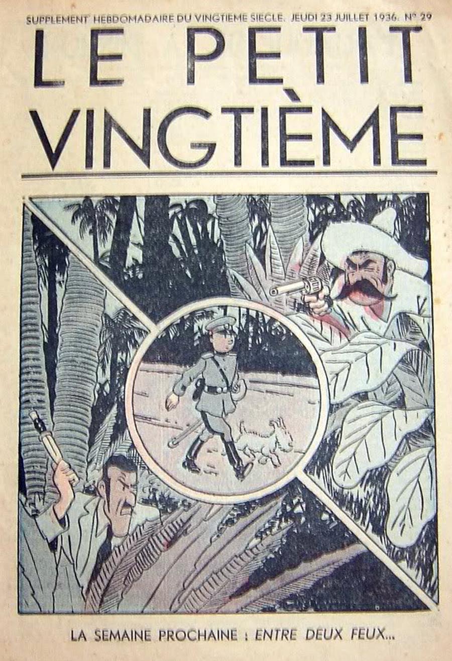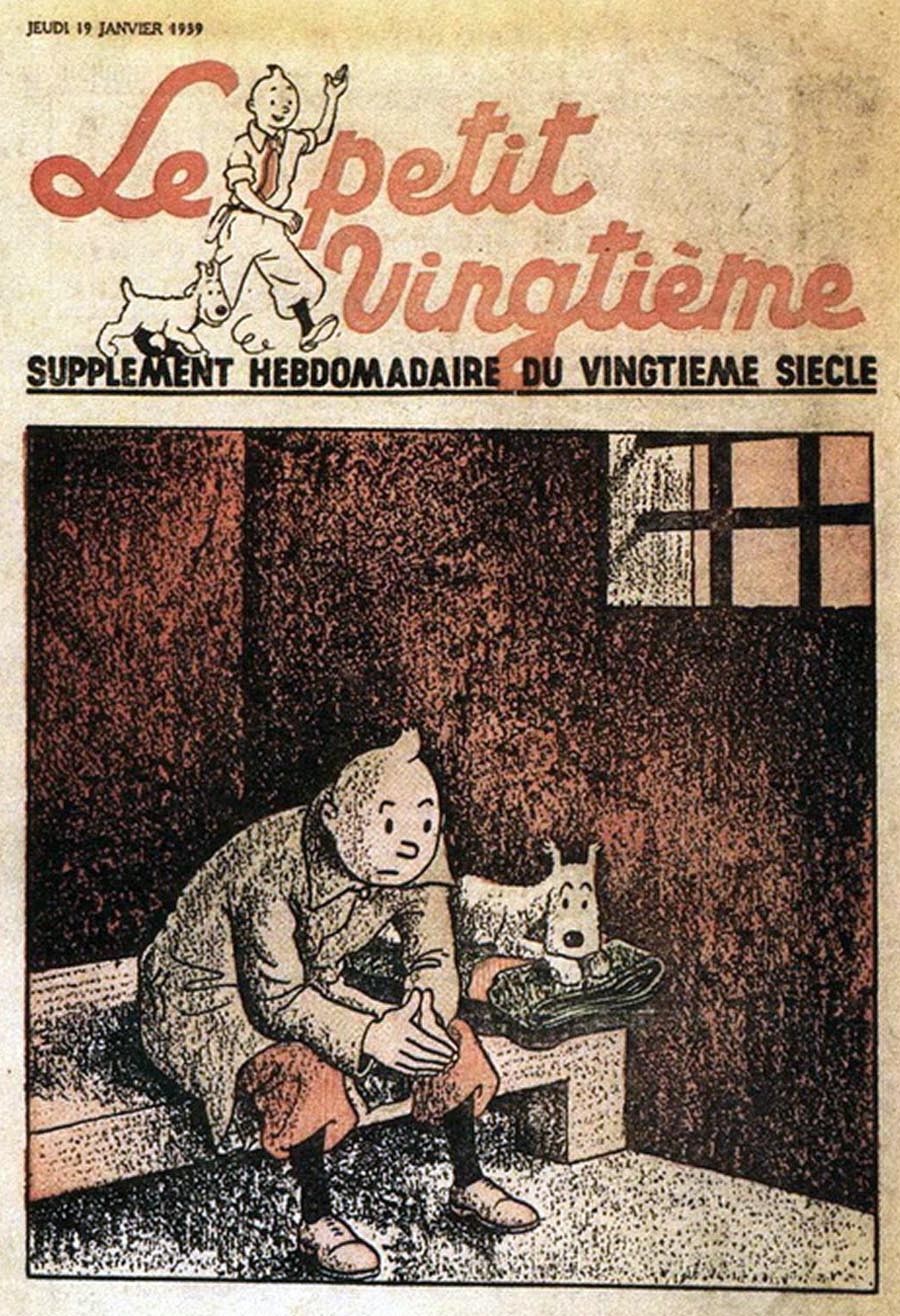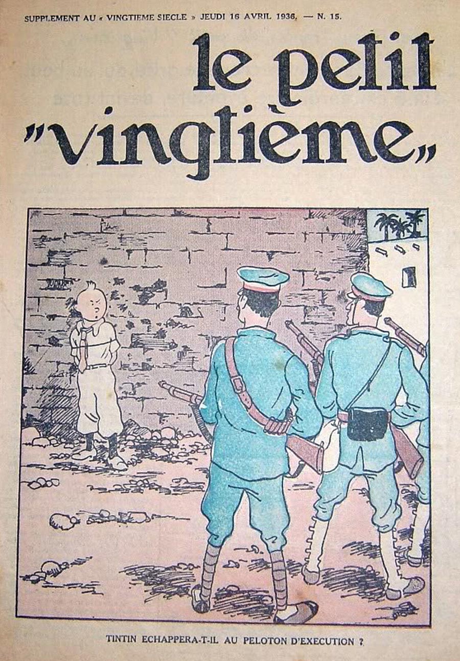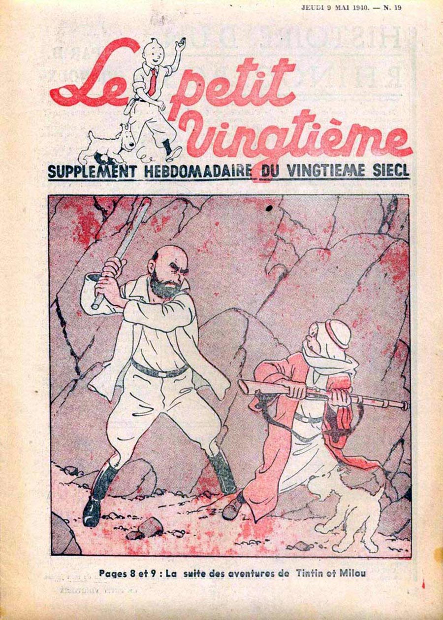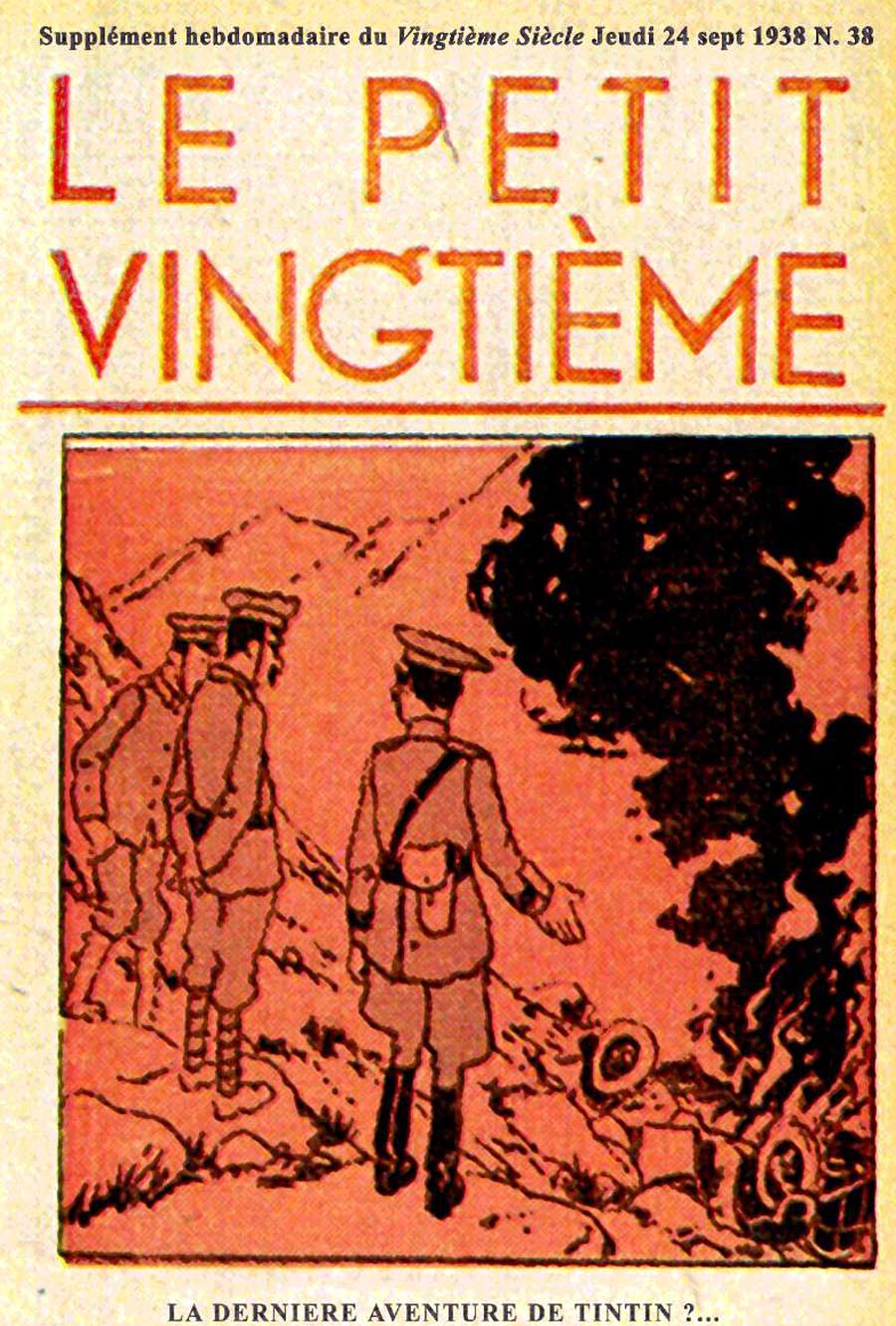 Pratiquement chaque semaine, jusqu’au 9 mai 1940, (date de l’invasion de la Belgique par les troupes allemandes) “Le Petit Vingtième” publiera sur une double page les Aventures de Tintin en pré-publication. La dernière aventure sera interrompue le 9 mai 1940 pour cause d’invasion allemande de la Belgique. La dernière case représentait Tintin, dans le désert, sous la menace du fusil de Müller.
