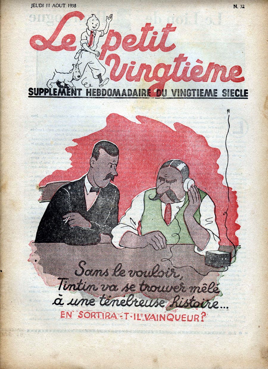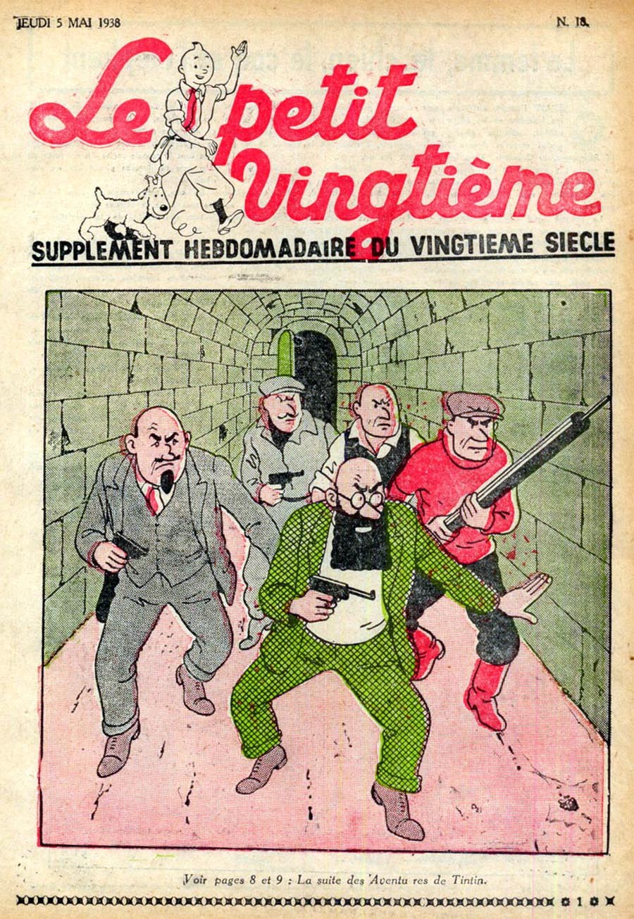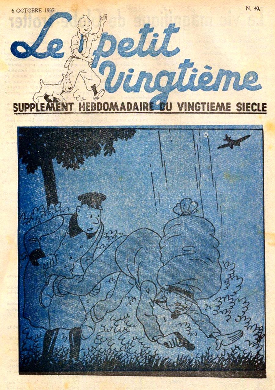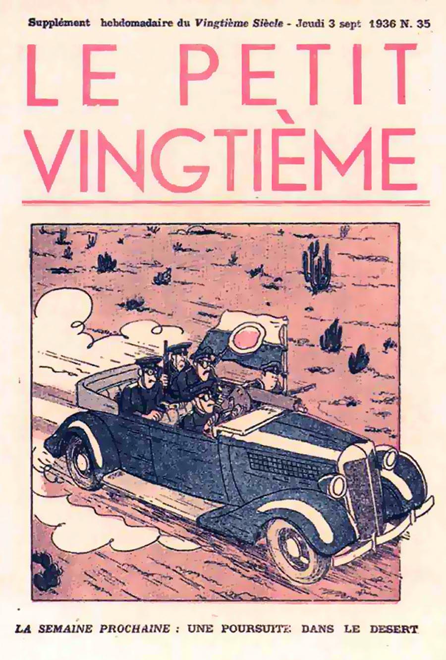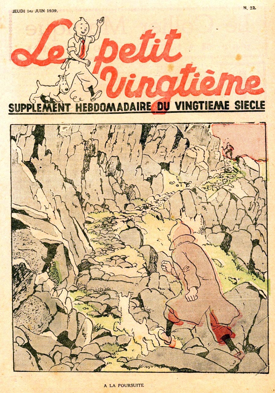 Pratiquement chaque semaine, jusqu’au 9 mai 1940, (date de l’invasion de la Belgique par les troupes allemandes) “Le Petit Vingtième” publiera sur une double page les Aventures de Tintin en pré-publication. La dernière aventure sera interrompue le 9 mai 1940 pour cause d’invasion allemande de la Belgique. La dernière case représentait Tintin, dans le désert, sous la menace du fusil de Müller.