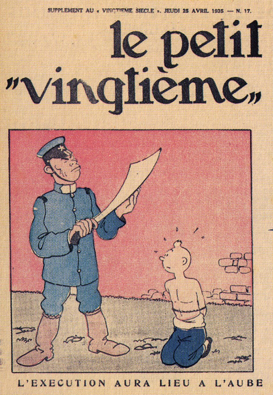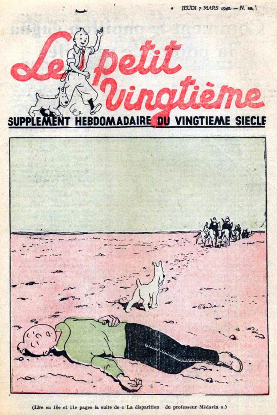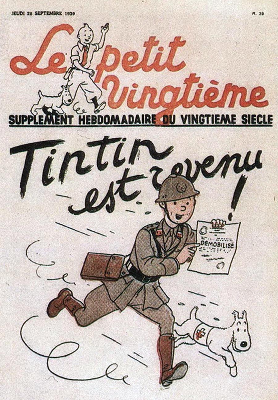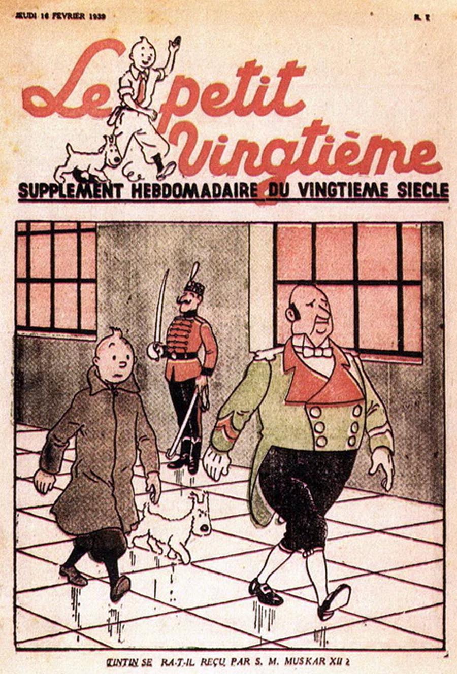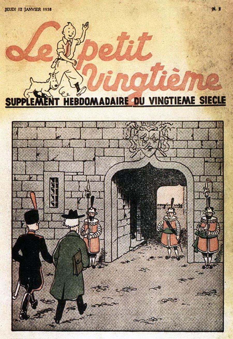 Pratiquement chaque semaine, jusqu’au 9 mai 1940, (date de l’invasion de la Belgique par les troupes allemandes) “Le Petit Vingtième” publiera sur une double page les Aventures de Tintin en pré-publication. La dernière aventure sera interrompue le 9 mai 1940 pour cause d’invasion allemande de la Belgique. La dernière case représentait Tintin, dans le désert, sous la menace du fusil de Müller.