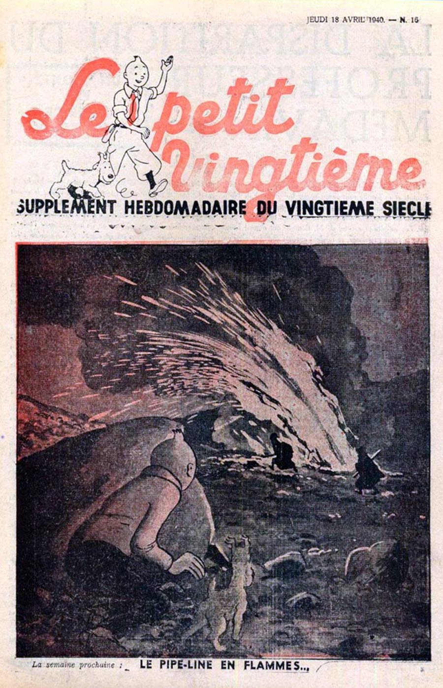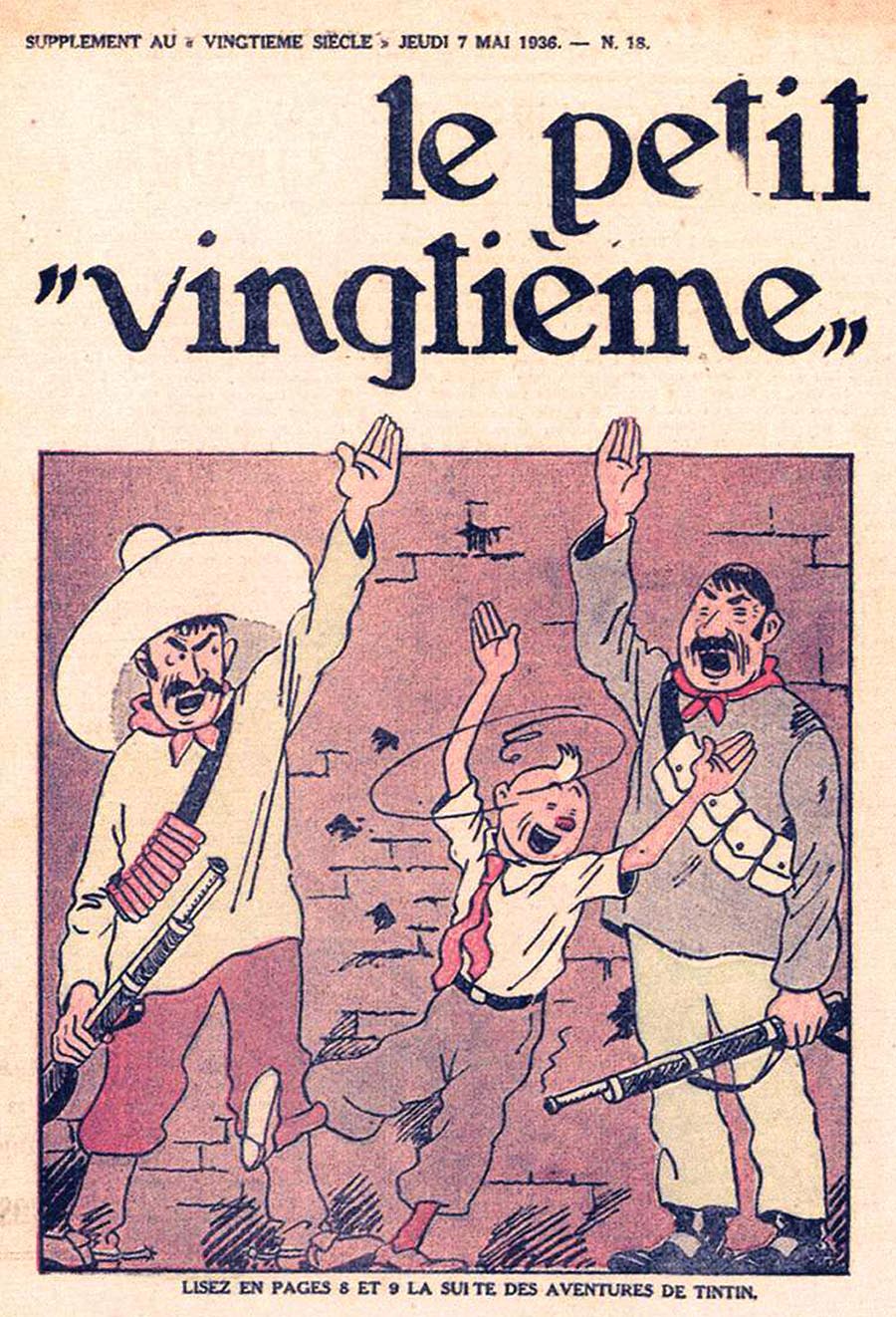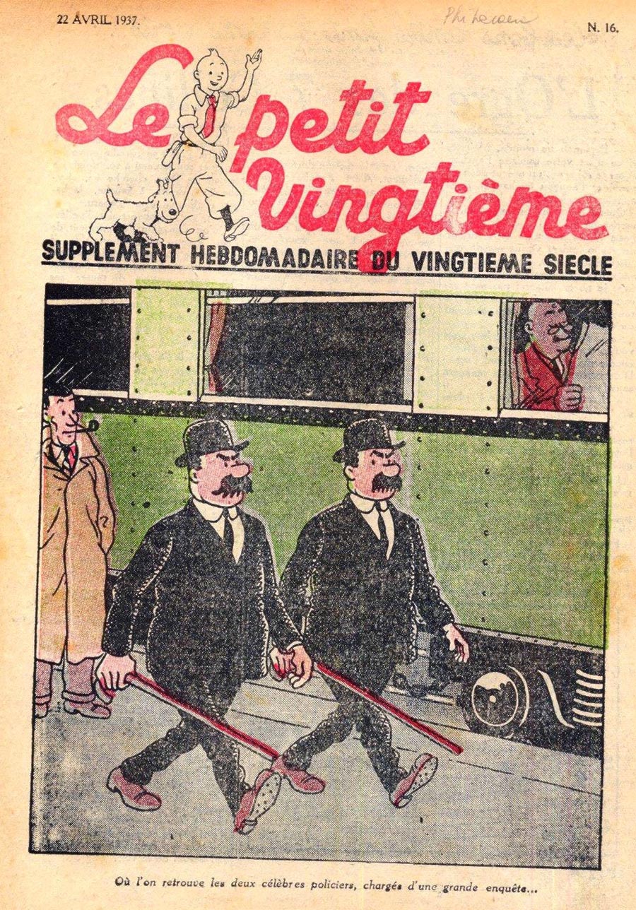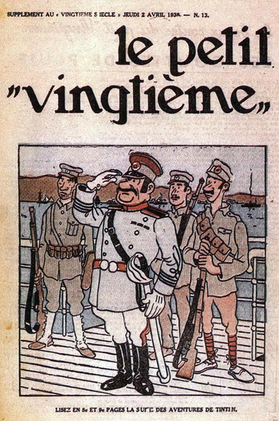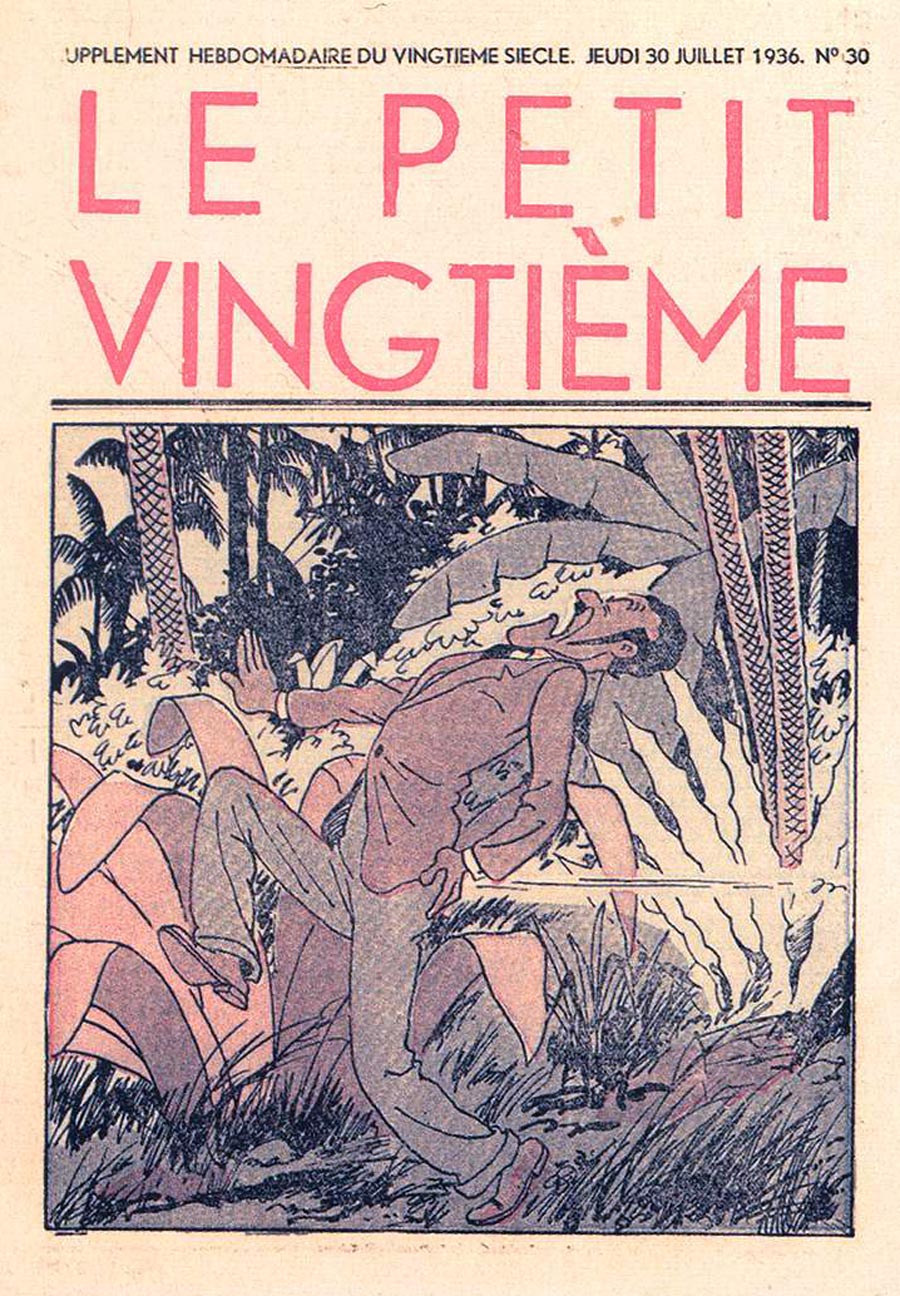 Pratiquement chaque semaine, jusqu’au 9 mai 1940, (date de l’invasion de la Belgique par les troupes allemandes) “Le Petit Vingtième” publiera sur une double page les Aventures de Tintin en pré-publication. La dernière aventure sera interrompue le 9 mai 1940 pour cause d’invasion allemande de la Belgique. La dernière case représentait Tintin, dans le désert, sous la menace du fusil de Müller.