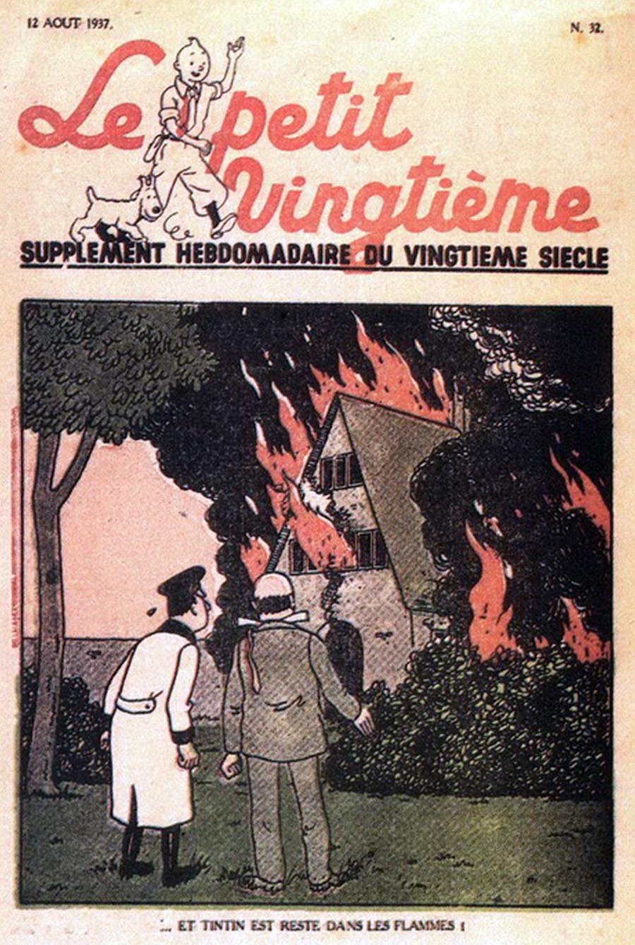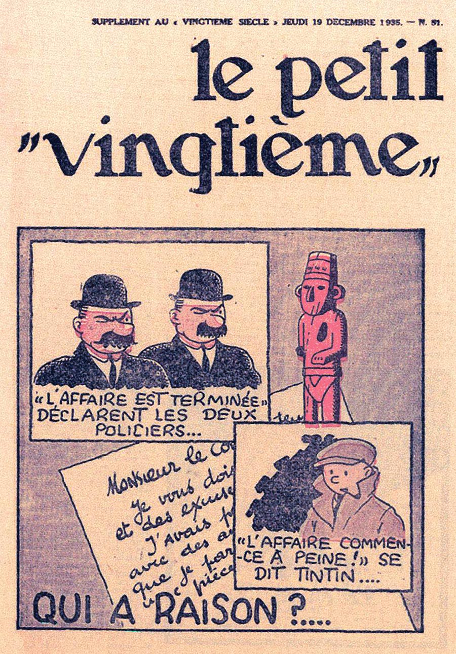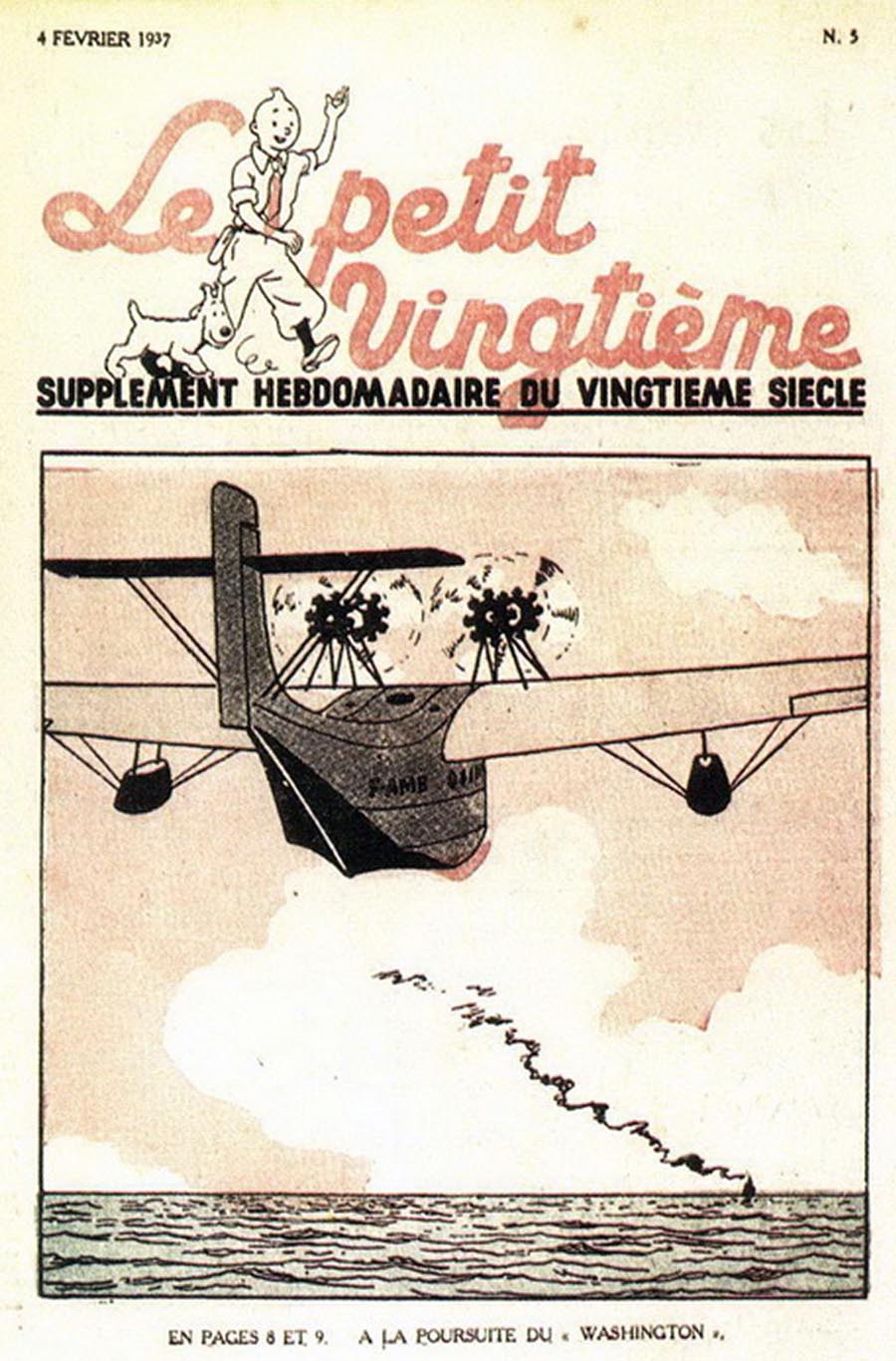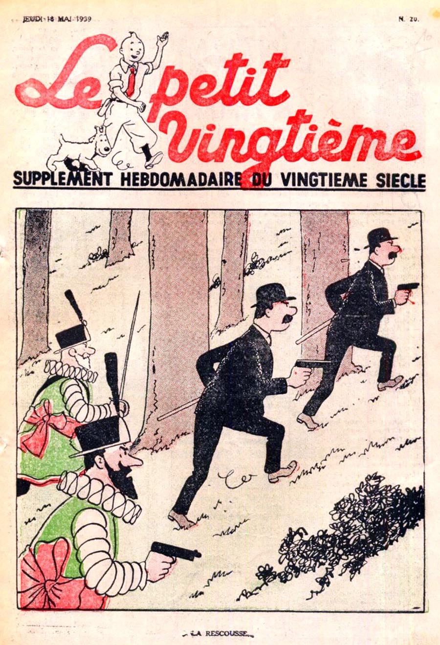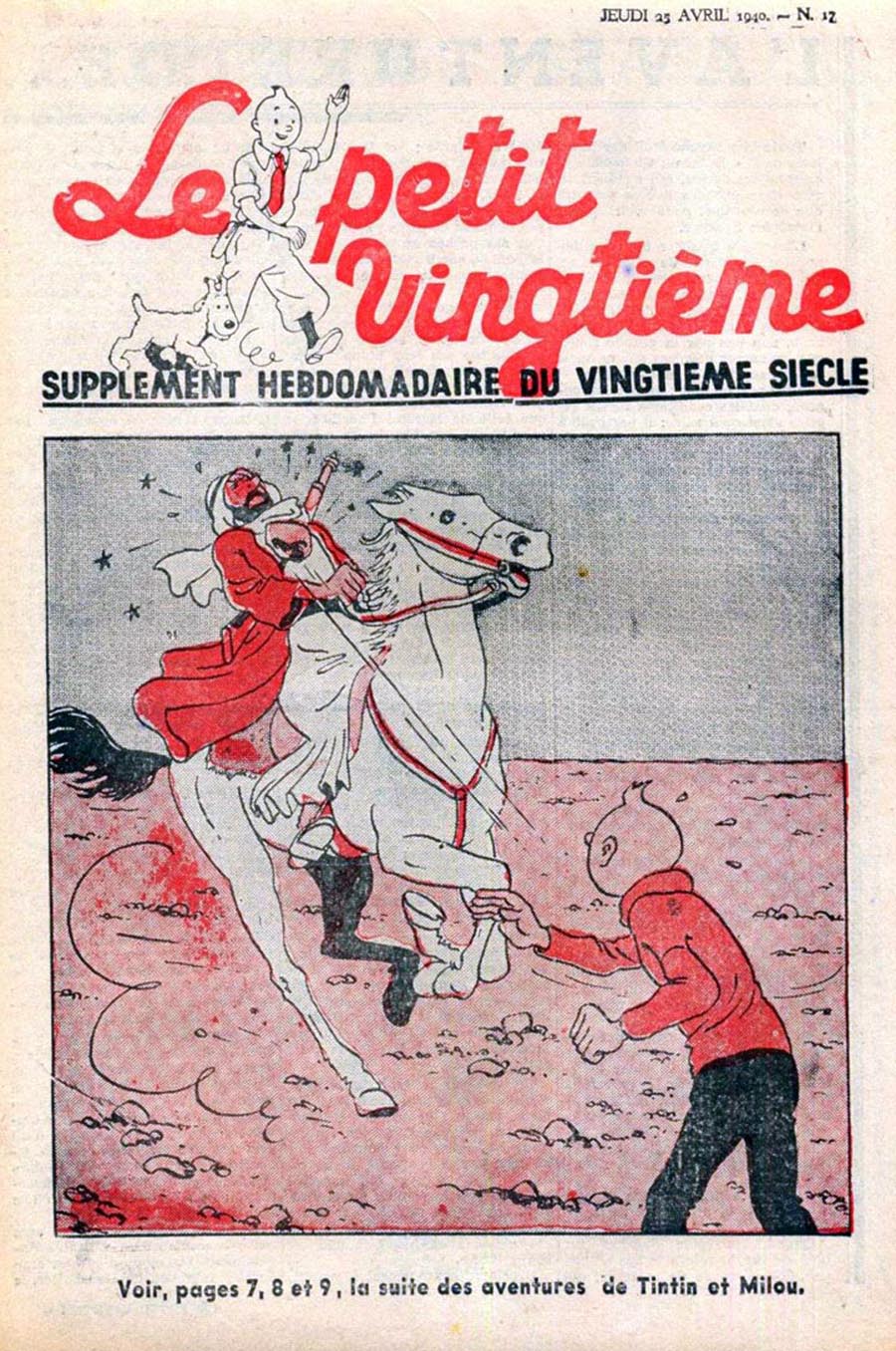 Pratiquement chaque semaine, jusqu’au 9 mai 1940, (date de l’invasion de la Belgique par les troupes allemandes) “Le Petit Vingtième” publiera sur une double page les Aventures de Tintin en pré-publication. La dernière aventure sera interrompue le 9 mai 1940 pour cause d’invasion allemande de la Belgique. La dernière case représentait Tintin, dans le désert, sous la menace du fusil de Müller.