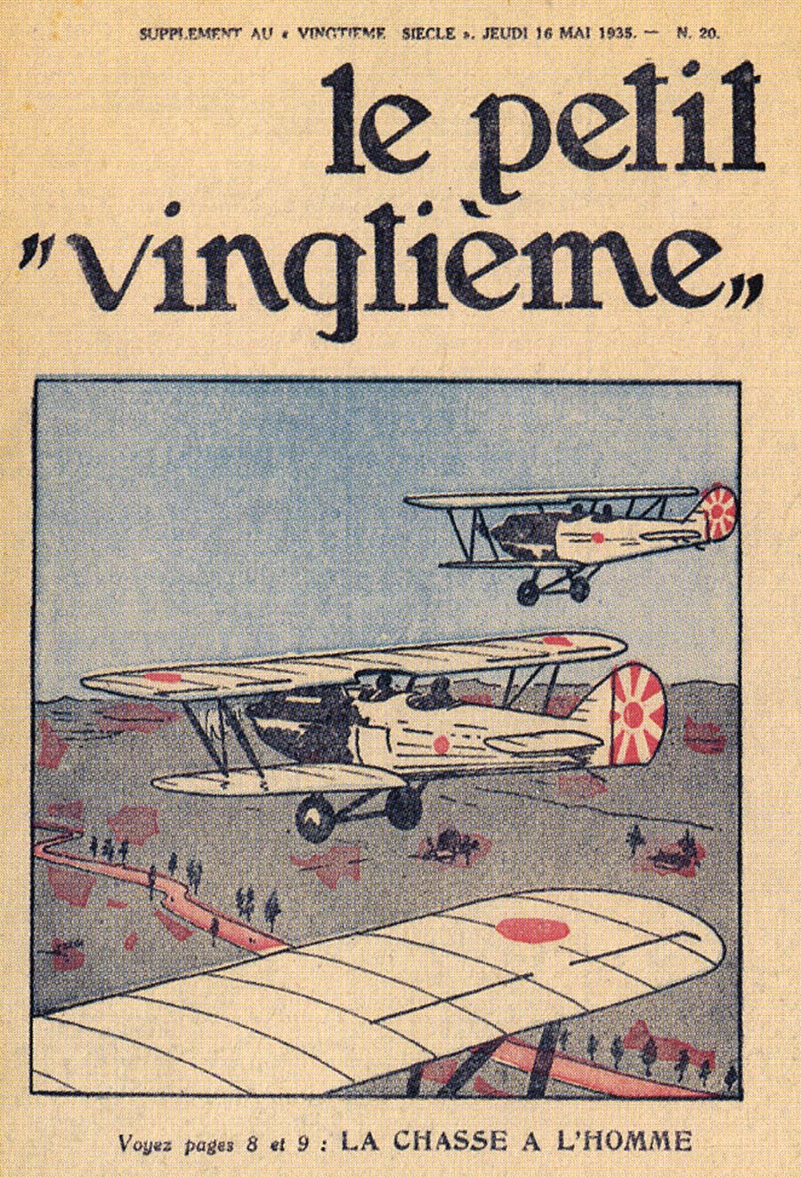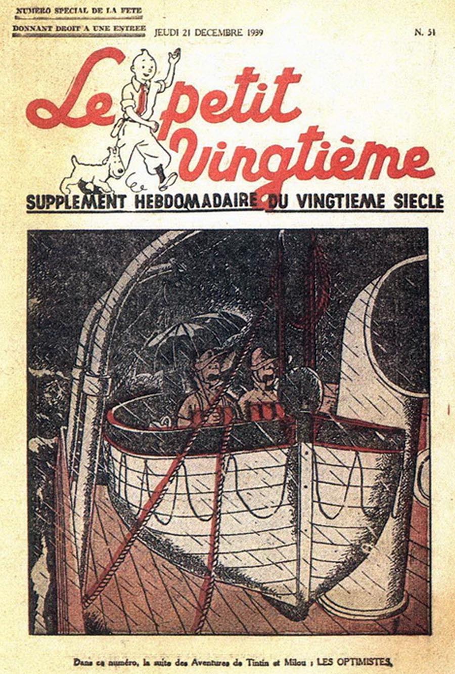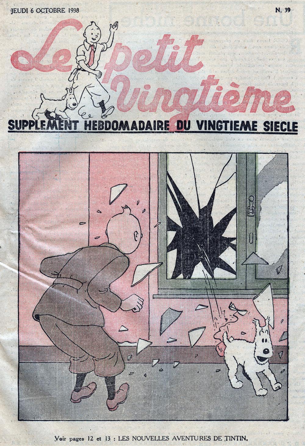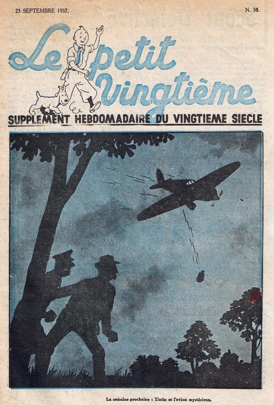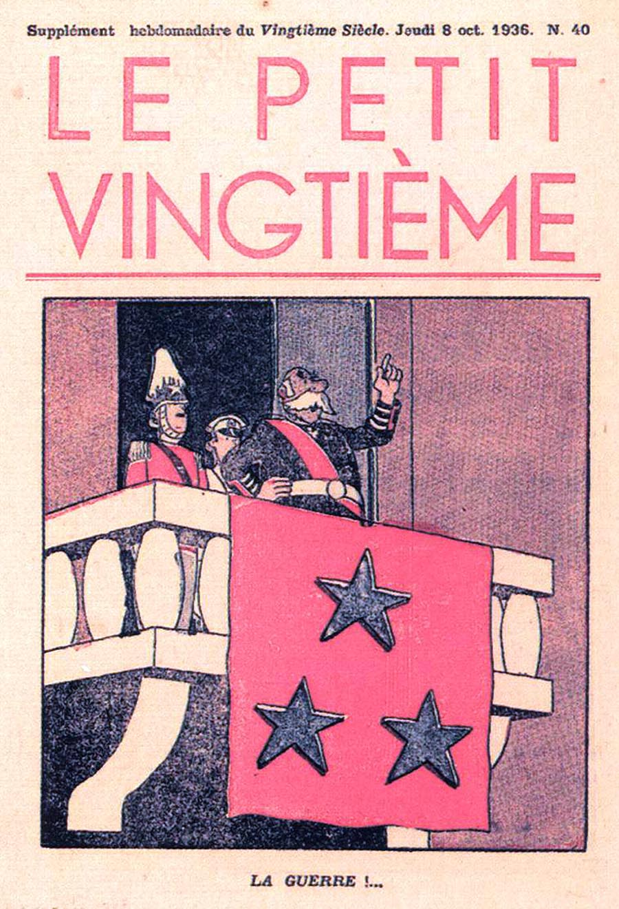 Pratiquement chaque semaine, jusqu’au 9 mai 1940, (date de l’invasion de la Belgique par les troupes allemandes) “Le Petit Vingtième” publiera sur une double page les Aventures de Tintin en pré-publication. La dernière aventure sera interrompue le 9 mai 1940 pour cause d’invasion allemande de la Belgique. La dernière case représentait Tintin, dans le désert, sous la menace du fusil de Müller.