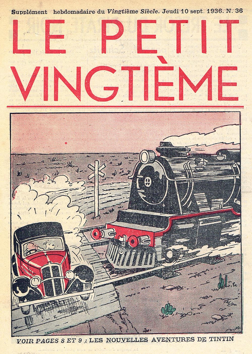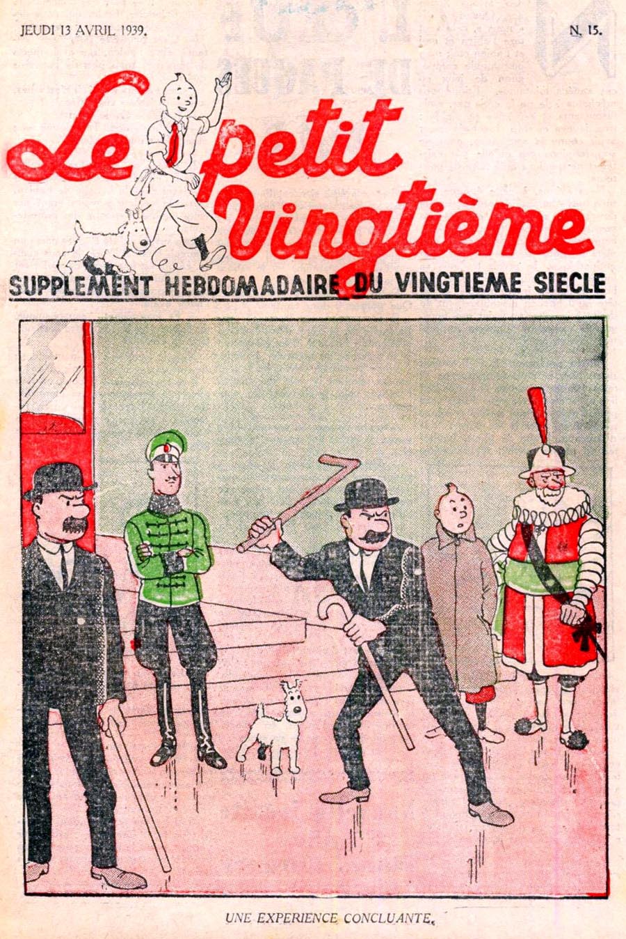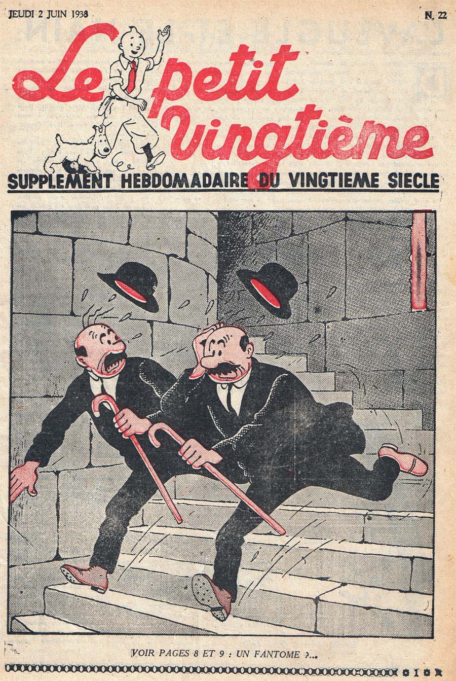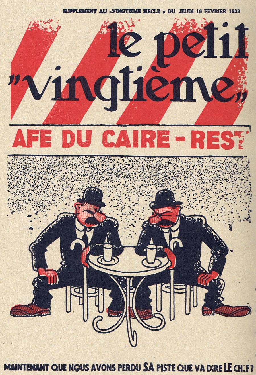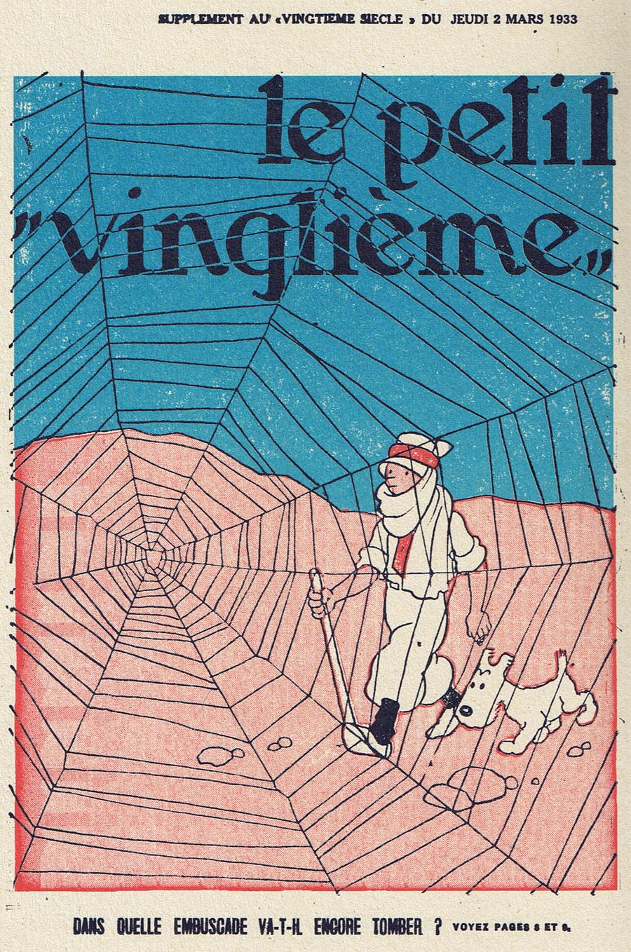 Pratiquement chaque semaine, jusqu’au 9 mai 1940, (date de l’invasion de la Belgique par les troupes allemandes) “Le Petit Vingtième” publiera sur une double page les Aventures de Tintin en pré-publication. La dernière aventure sera interrompue le 9 mai 1940 pour cause d’invasion allemande de la Belgique. La dernière case représentait Tintin, dans le désert, sous la menace du fusil de Müller.